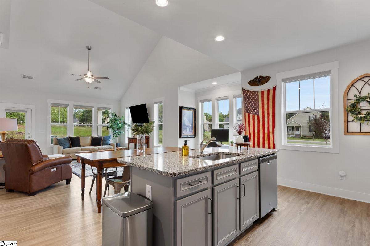 Come and see this gorgeous end unit Townhome in the sought-after Sheffield Village community across from Smithfields Golf Course! This 3 Bedroom, 2.5 Bath townhome with private primary suite on the main level blends high-end designer finishes with low-maintenance living. The side porch entry welcomes you to easy access to the mud room, powder room and coat closet. No carrying laundry up and down stairs with laundry facilities on each level of this home! The open kitchen, with its central work island and breakfast bar, means the chef can chat with friends and family while preparing meals! There is also plenty of storage and granite countertop space. The family room offers plenty of natural light, vaulted ceiling, custom pull-down blinds, and ample open-concept space for everyone. The main level primary suite features a spacious walk in closet, dual vanity, private water closet, shower, and large linen closet. The second level includes a large open loft, flexible to use as a play area, study, or additional living space. Two additional bedrooms, a hall bath and laundry room round out the upper level. This home has been beautifully maintained and is like new! The stainless appliances and the washer and dryer will remain with the home. The low HOA fee includes lawn maintenance, walking trails, a neighborhood pond, and pest control. While this property is not obligated to the golf course dues, it has access to the Smithfield golf course amenities and golf course membership. Located between Greenville and Clemson, 20 miles from Clemson University and the surrounding Lakes Hartwell and Keowee, and just minutes to historic downtown Easley and Greenville. Schedule your private showing today!