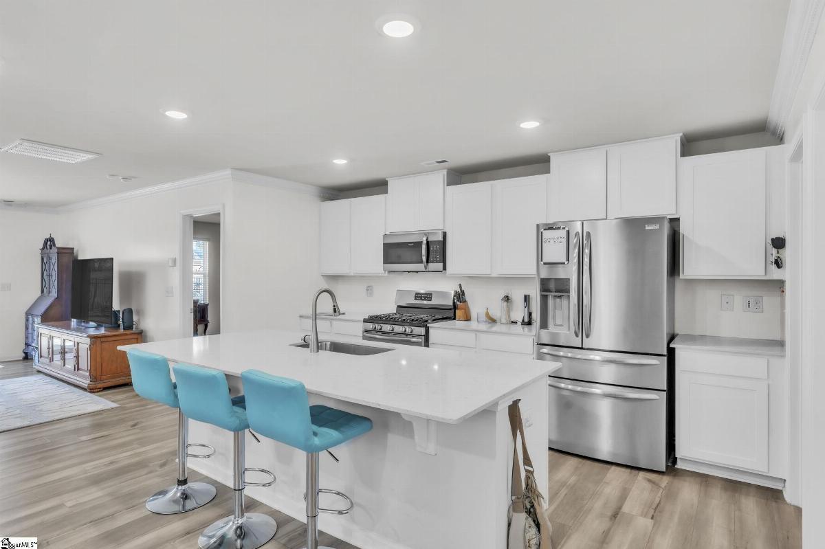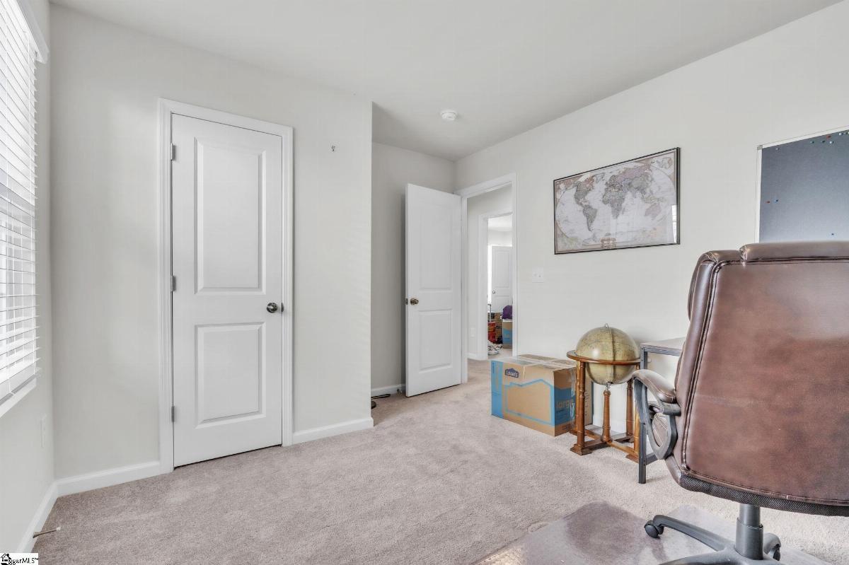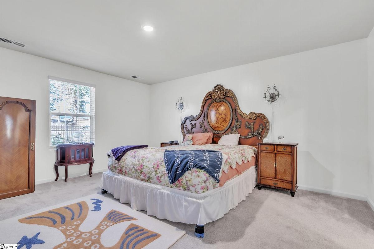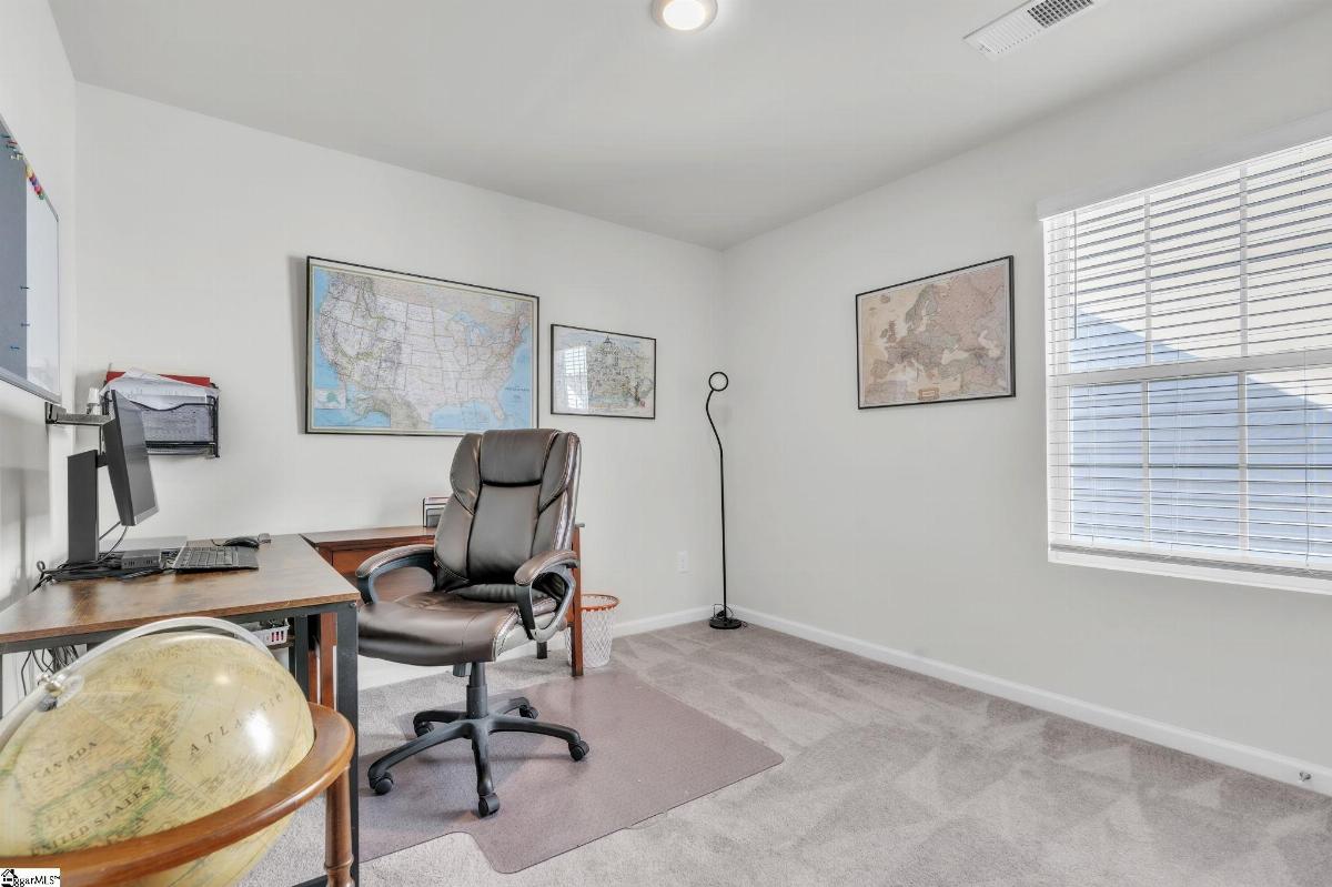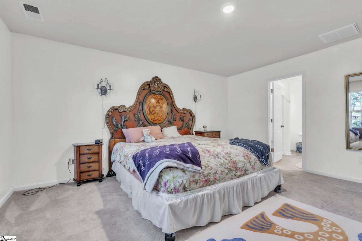 Spacious and beautifully located, this 4 year old house is better-than-new, with 5 bedrooms, 2.5 baths, a flex room, and more than 2300 sq. feet of comfortable living space. Approaching the house, you will be impressed by the low maintenance, professionally landscaped yard (with Rainbird irrigation). The front porch offers plenty of room to greet guests or just watch the world go by. Open the door and enter the spacious foyer, made elegant with fresh paint, crown molding and unique light fixtures. Just off the foyer, the powder room has been enhanced with bright paint, wide chair rails, a lovely old-world style vanity and a stunning chandelier. Next we go to the open concept kitchen and great room. The kitchen design is perfect for entertaining, featuring quartz countertops, a gas range, and a large central island that flows seamlessly into the living and dining areas. The kitchen has stainless steel appliances and tons of soft-close, Shaker-style cabinets. The laundry room is located near the kitchen, and another door leads to the large walk-in pantry. The large living area is steps away, stylish and contemporary with more crown molding, and a beautiful chandelier. A sliding glass door leads out to the custom built patio in the fenced-in back yard, professionally designed and planted with easy care shrubs and flowers. The primary suite is located on the ground floor for easy access and is a private retreat from the 4 other bedrooms upstairs. There is a large walk-in shower in the en suite, and one of the best closets ever! Upstairs, the flex room is perfect for home schooling or hobbyists, and has custom-built counters, shelving and cabinets. 4 more bedrooms with large closets and a full bath complete this 2 story home. This house is perfectly situated with schools, shopping, entertainment options, medical and professional offices, downtown Easley and the lively Silos district just minutes away. The mountains are visible from the back yard, an d the neighborhood play area, picnic grounds, and dog park (all fenced in for safety) are located behind the house, just a short walk from your back gate. Enjoy the ease of access to Interstate 85 (7 miles away) and Hwy 123, making commutes to Greenville or Clemson simple and stress free.