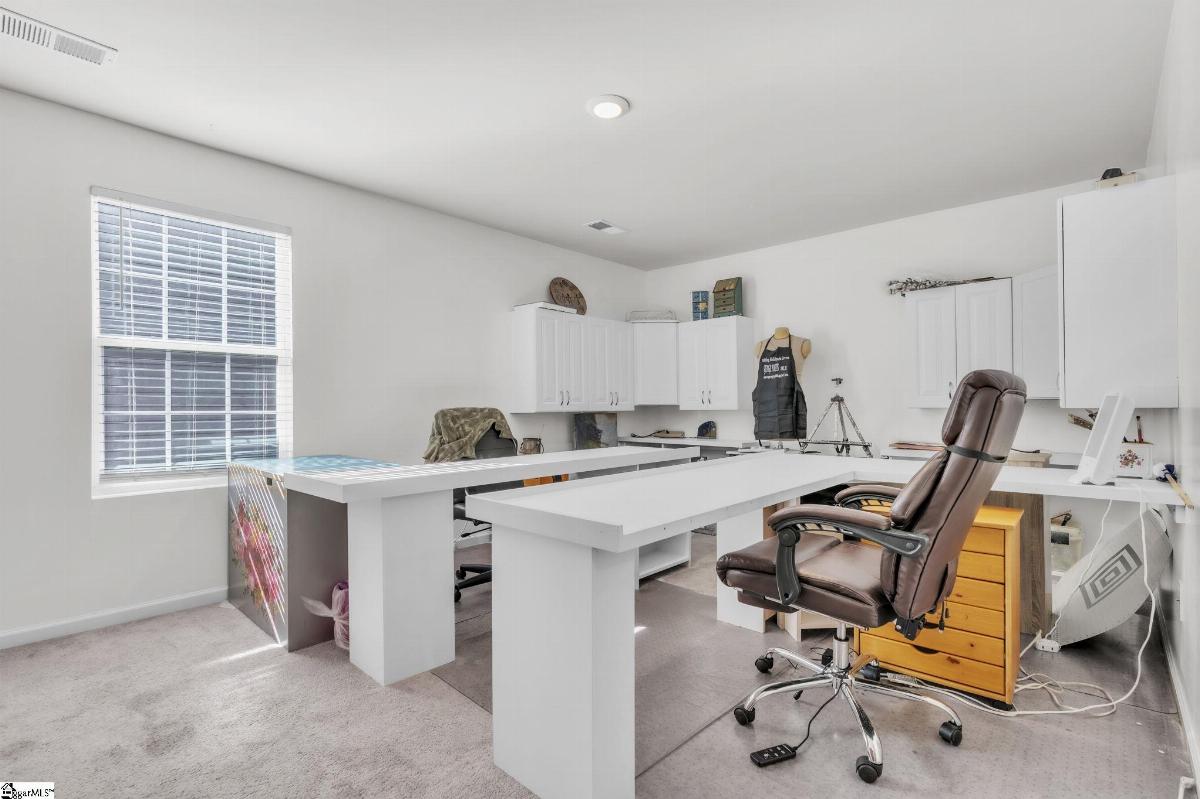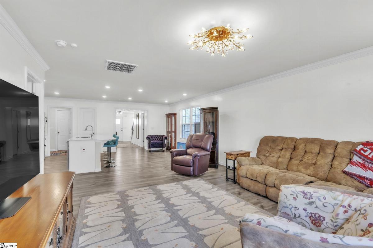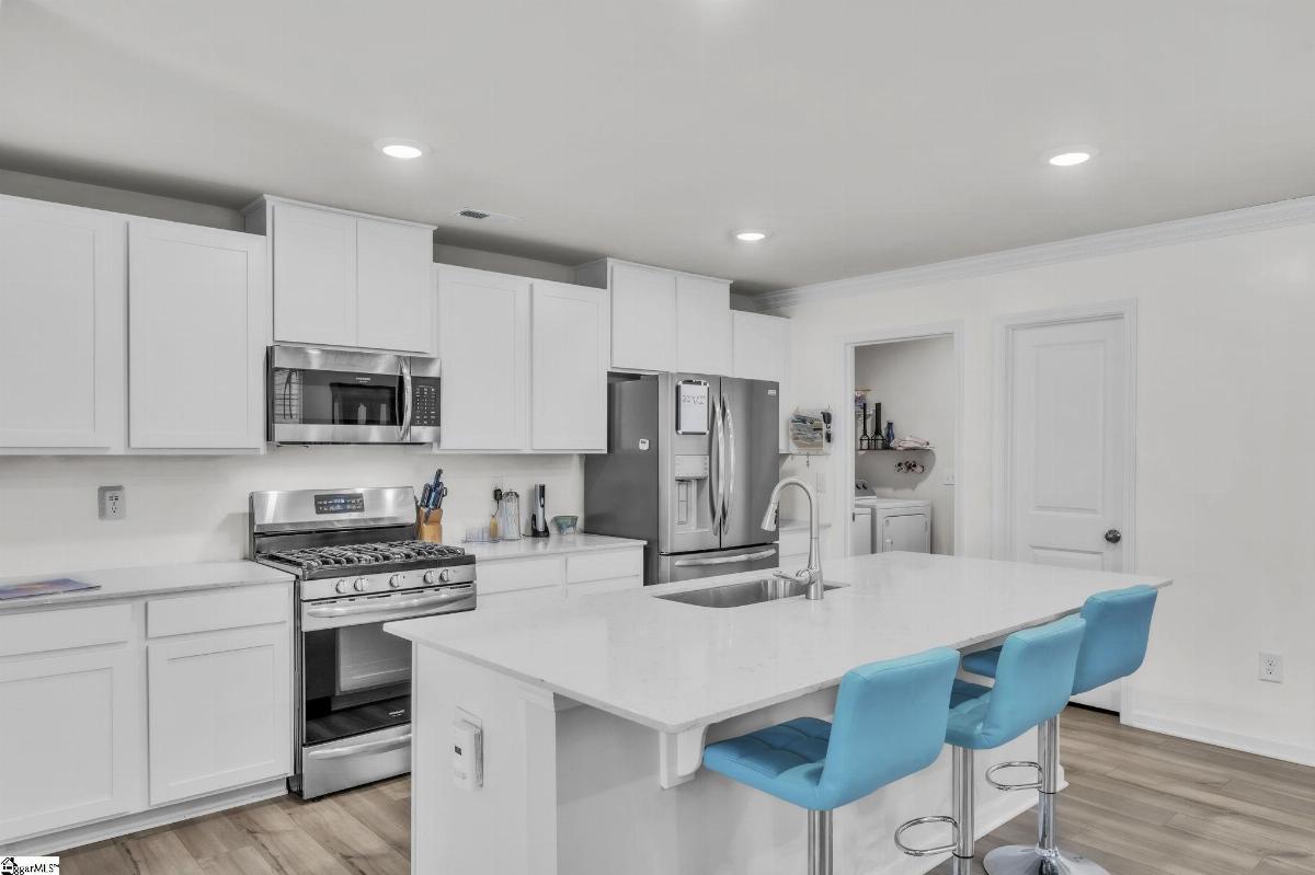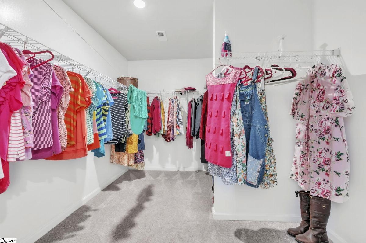 Spacious and beautifully located, this 4 year old house is better-than-new, with 5 bedrooms, 2.5 baths, a flex room, and more than 2300 sq. feet of comfortable living space. Approaching the house, you will be impressed by the low maintenance, professionally landscaped yard (with Rainbird irrigation). The front porch offers plenty of room to greet guests or just watch the world go by. Open the door and enter the spacious foyer, made elegant with fresh paint, crown molding and unique light fixtures. Just off the foyer, the powder room has been enhanced with bright paint, wide chair rails, a lovely old-world style vanity and a stunning chandelier. Next we go to the open concept kitchen and great room. The kitchen design is perfect for entertaining, featuring quartz countertops, a gas range, and a large central island that flows seamlessly into the living and dining areas. The kitchen has stainless steel appliances and tons of soft-close, Shaker-style cabinets. The laundry room is located near the kitchen, and another door leads to the large walk-in pantry. The large living area is steps away, stylish and contemporary with more crown molding, and a beautiful chandelier. A sliding glass door leads out to the custom built patio in the fenced-in back yard, professionally designed and planted with easy care shrubs and flowers. The primary suite is located on the ground floor for easy access and is a private retreat from the 4 other bedrooms upstairs. There is a large walk-in shower in the en suite, and one of the best closets ever! Upstairs, the flex room is perfect for home schooling or hobbyists, and has custom-built counters, shelving and cabinets. 4 more bedrooms with large closets and a full bath complete this 2 story home. This house is perfectly situated with schools, shopping, entertainment options, medical and professional offices, downtown Easley and the lively Silos district just minutes away. The mountains are visible from the back yard, an d the neighborhood play area, picnic grounds, and dog park (all fenced in for safety) are located behind the house, just a short walk from your back gate. Enjoy the ease of access to Interstate 85 (7 miles away) and Hwy 123, making commutes to Greenville or Clemson simple and stress free.