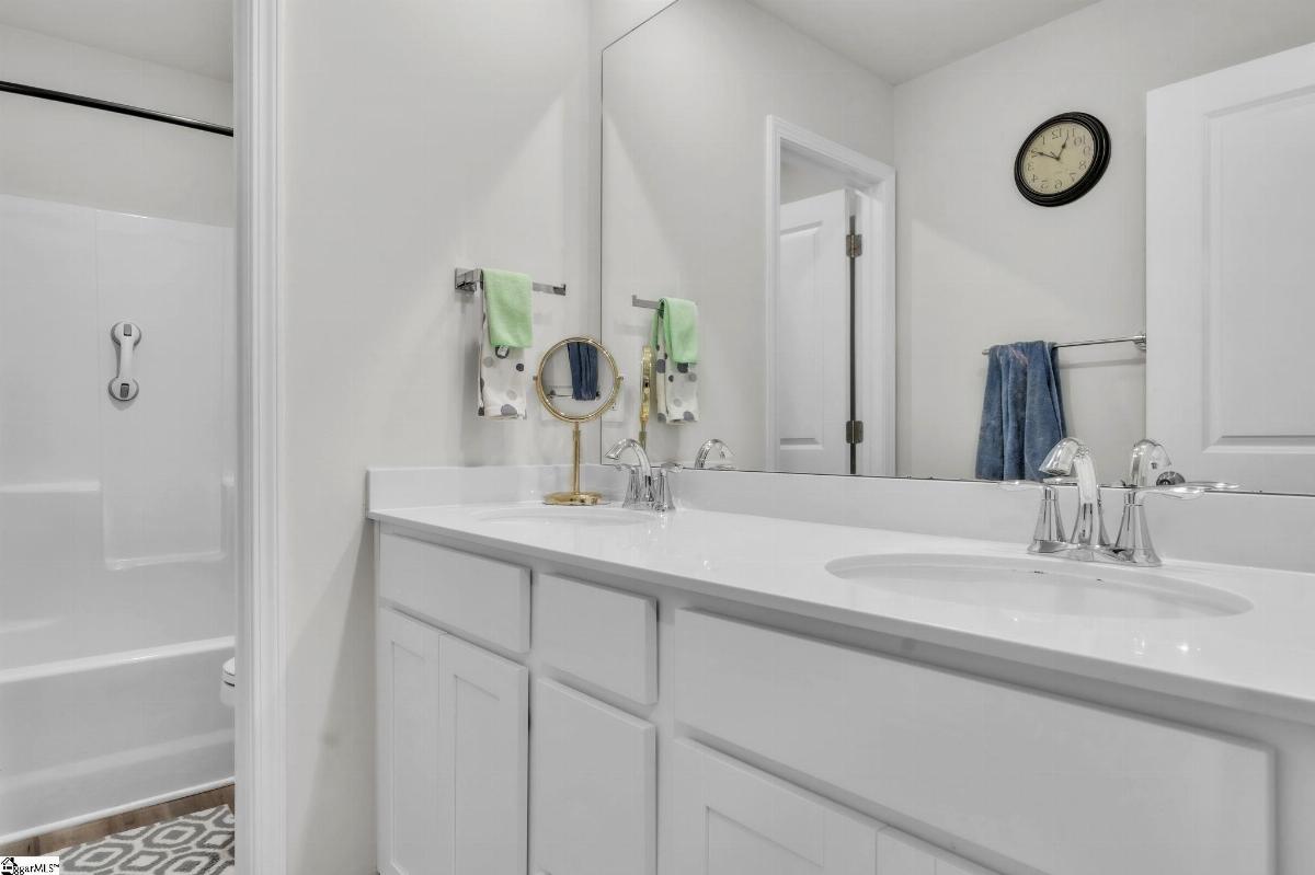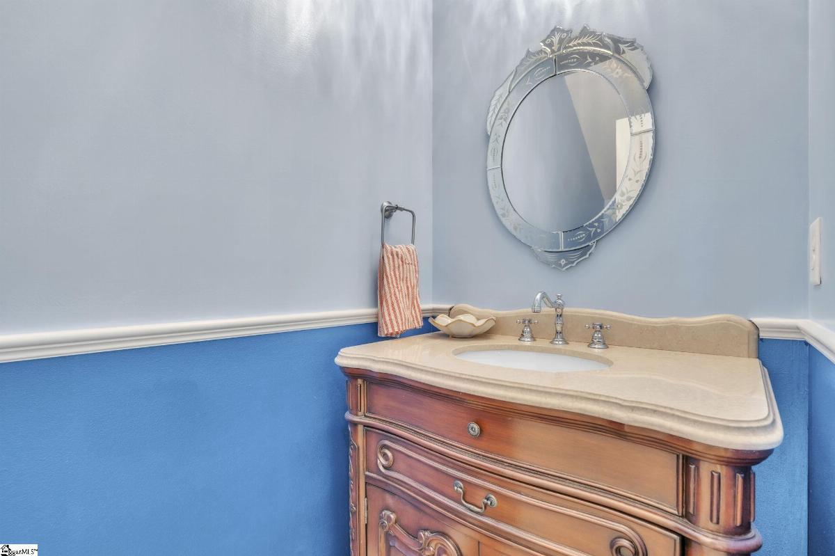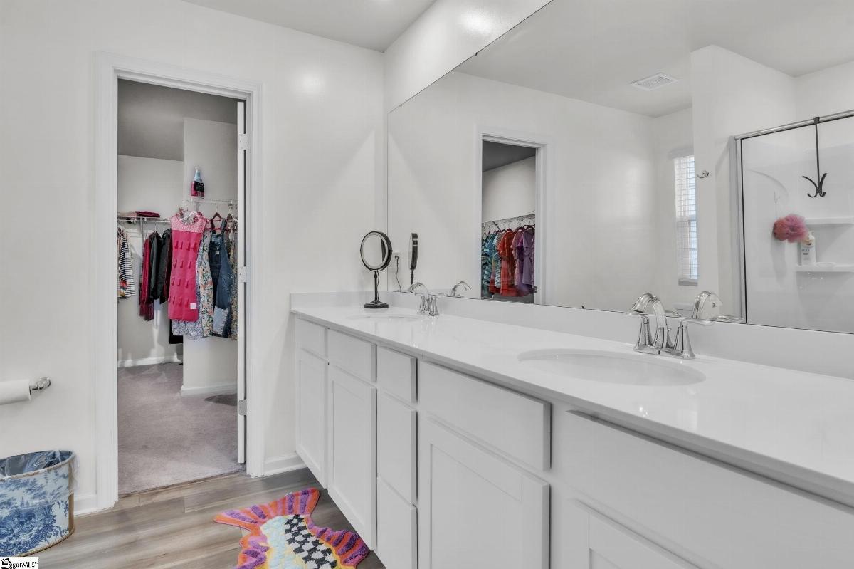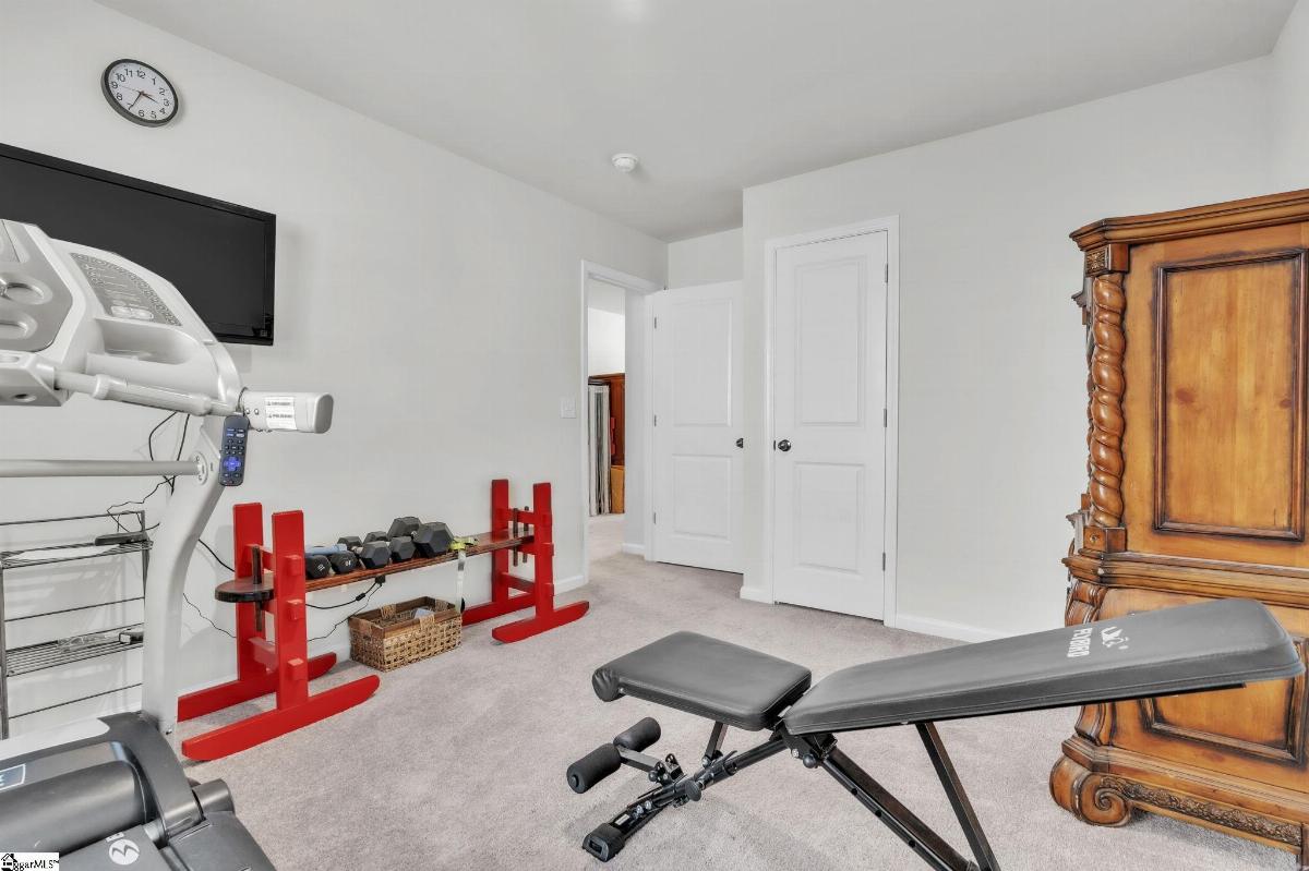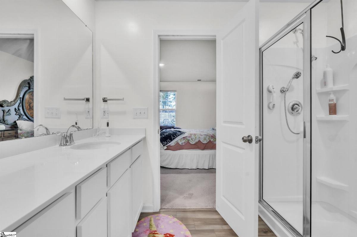 Spacious and beautifully located, this 4 year old house is better-than-new, with 5 bedrooms, 2.5 baths, a flex room, and more than 2300 sq. feet of comfortable living space. Approaching the house, you will be impressed by the low maintenance, professionally landscaped yard (with Rainbird irrigation). The front porch offers plenty of room to greet guests or just watch the world go by. Open the door and enter the spacious foyer, made elegant with fresh paint, crown molding and unique light fixtures. Just off the foyer, the powder room has been enhanced with bright paint, wide chair rails, a lovely old-world style vanity and a stunning chandelier. Next we go to the open concept kitchen and great room. The kitchen design is perfect for entertaining, featuring quartz countertops, a gas range, and a large central island that flows seamlessly into the living and dining areas. The kitchen has stainless steel appliances and tons of soft-close, Shaker-style cabinets. The laundry room is located near the kitchen, and another door leads to the large walk-in pantry. The large living area is steps away, stylish and contemporary with more crown molding, and a beautiful chandelier. A sliding glass door leads out to the custom built patio in the fenced-in back yard, professionally designed and planted with easy care shrubs and flowers. The primary suite is located on the ground floor for easy access and is a private retreat from the 4 other bedrooms upstairs. There is a large walk-in shower in the en suite, and one of the best closets ever! Upstairs, the flex room is perfect for home schooling or hobbyists, and has custom-built counters, shelving and cabinets. 4 more bedrooms with large closets and a full bath complete this 2 story home. This house is perfectly situated with schools, shopping, entertainment options, medical and professional offices, downtown Easley and the lively Silos district just minutes away. The mountains are visible from the back yard, an d the neighborhood play area, picnic grounds, and dog park (all fenced in for safety) are located behind the house, just a short walk from your back gate. Enjoy the ease of access to Interstate 85 (7 miles away) and Hwy 123, making commutes to Greenville or Clemson simple and stress free.
