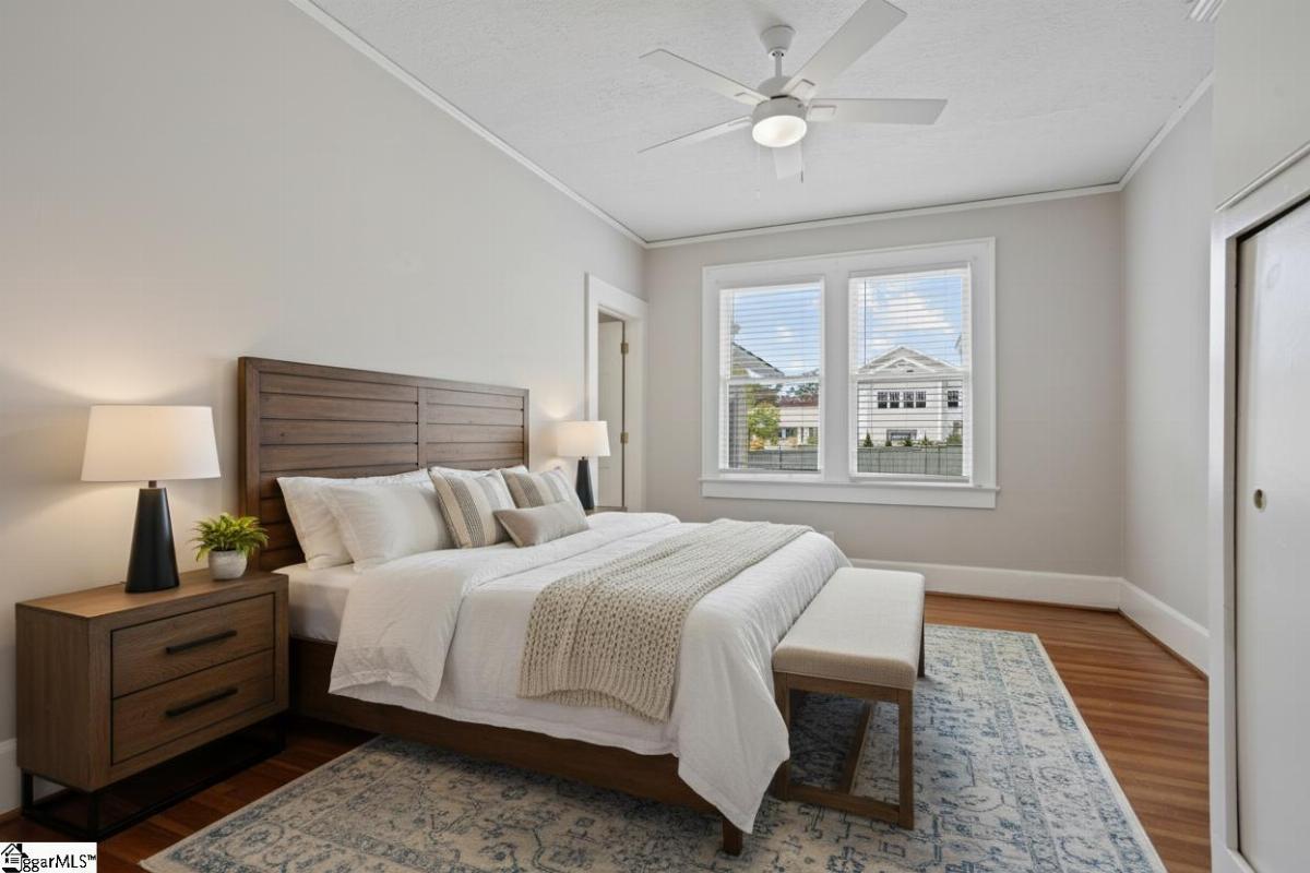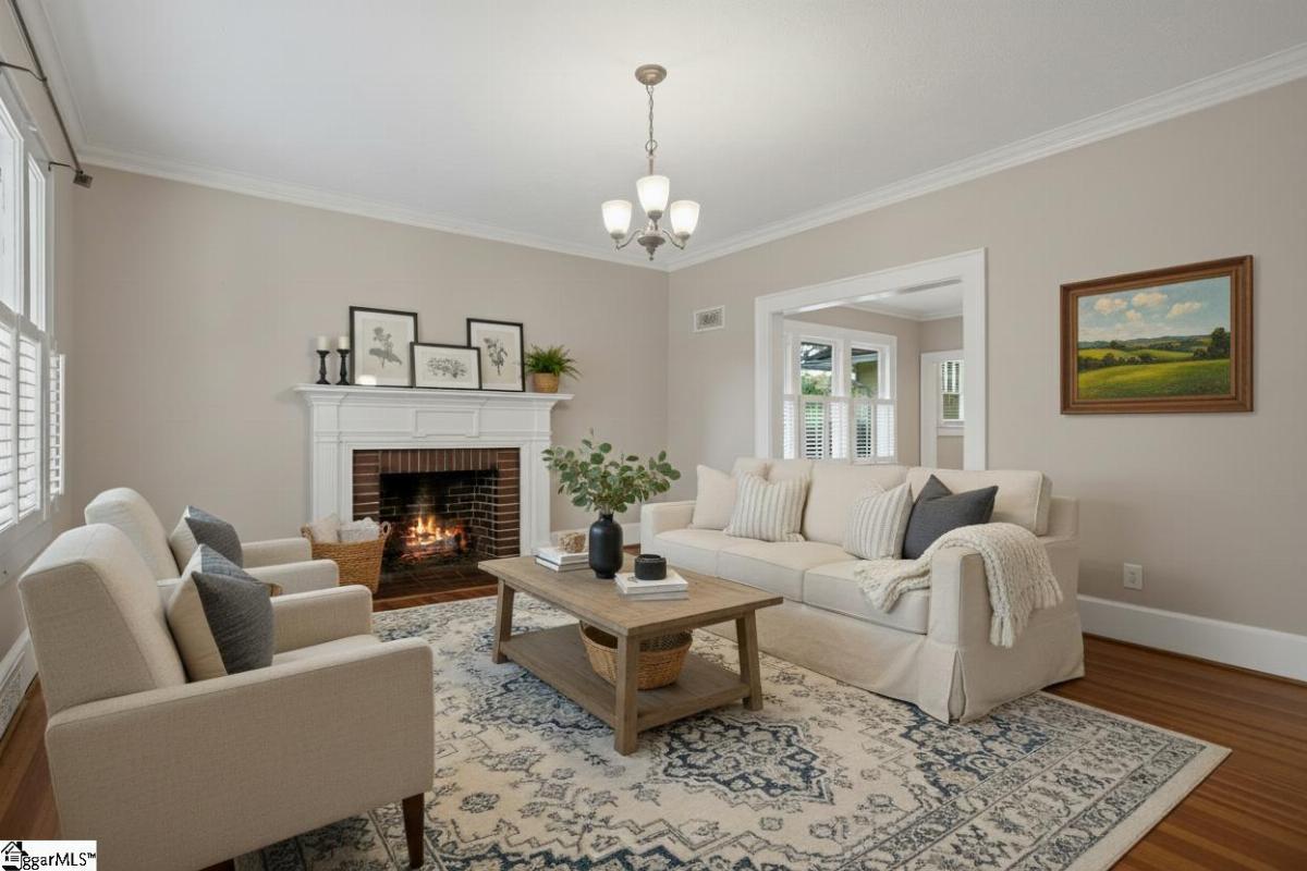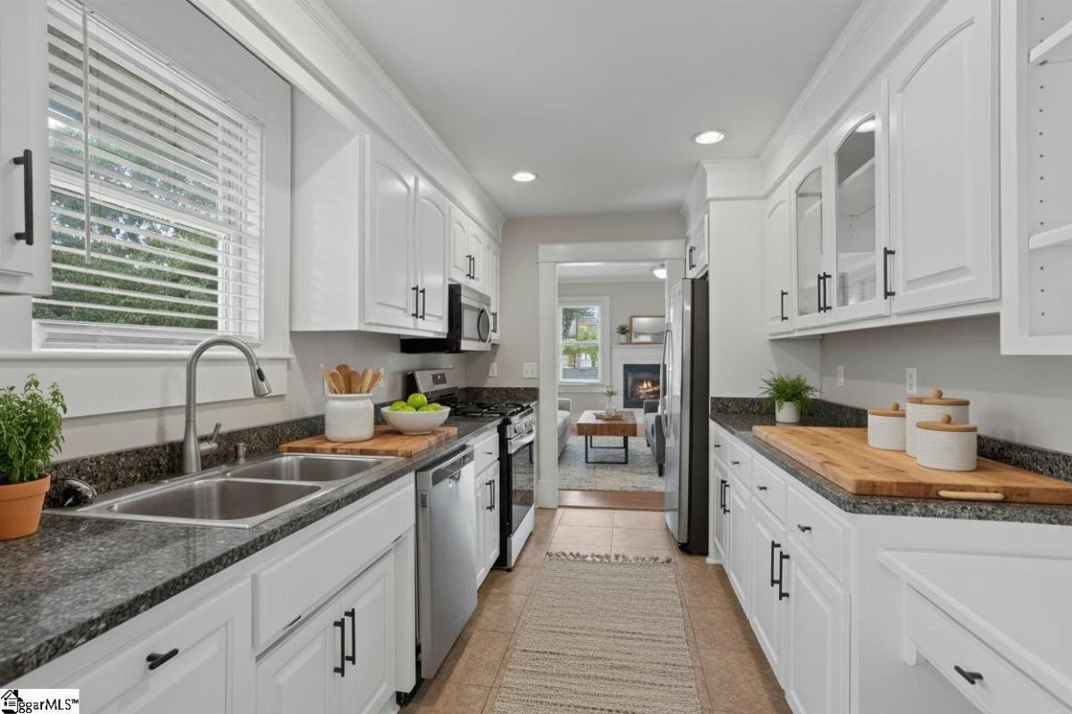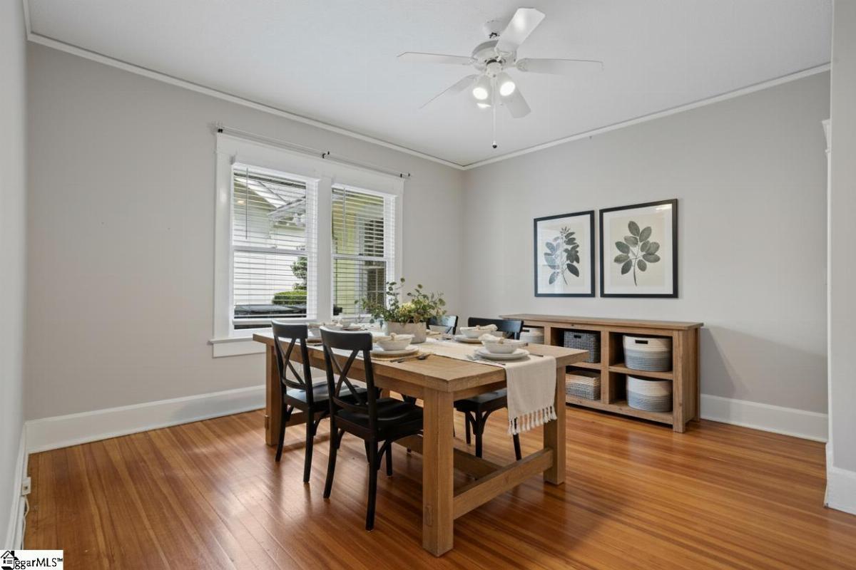 This historic 1916 craftsman style bungalow in the Augusta Road area offers over 3,100 square feet of flexible living space in one of Greenville’s most desirable neighborhoods. With a newer roof, updated HVAC, new hot water heater and a fully renovated kitchen, the home combines historic character with modern updates.The main level includes a large living room with fireplace, formal dining, a study, and three bedrooms including the primary suite. The kitchen features granite countertops, updated appliances, and connects to a breakfast nook and oversized laundry room. A dedicated dressing room adds extra storage and functionality. Upstairs, two additional bedrooms and a full bath provide plenty of room for family or guests. Multiple fireplaces, wide hallways, and original hardwood floors highlight the home’s craftsmanship. A family room off the back opens through French doors to a deck and a flat, fenced backyard—ideal for gatherings, play, or gardening. The backyard also includes a shed/workshop and plenty of off street parking. Outdoor living is just as inviting, with a wide front porch set on one of the broadest streets in the Augusta Road area. Zoned for Augusta Circle Elementary and only minutes from downtown Greenville, this home offers space, location, and community. Photos have been virtually staged.