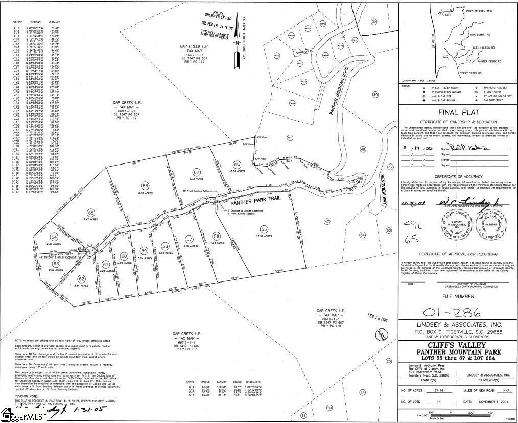 Nestled in the mountains just minutes from Greenville, SC, make yourself at home in the comfort and convenience of The Cliffs Valley gated golf and wellness community. Breathtaking long range mountain view lot in the Panther Mountain Park section of Cliffs Valley at an elevation greater than 2,000 feet. You’ll take in big southern views of Paris Mountain towards downtown Greenville and Travelers Rest and of the layered mountain ridges back to the southwest. This gently sloping homesite will allow the design of a range of house styles and designs. The location is also convenient to the community’s north gate off Highway 25, providing easy access to shopping and dining in the charming towns of Flat Rock and Hendersonville, NC. The Blue Ridge water tap fee is paid. A driveway and utility easement runs between Lots 63 and 64. A Club membership at The Cliffs is available for purchase with this property giving you access to all seven communities.