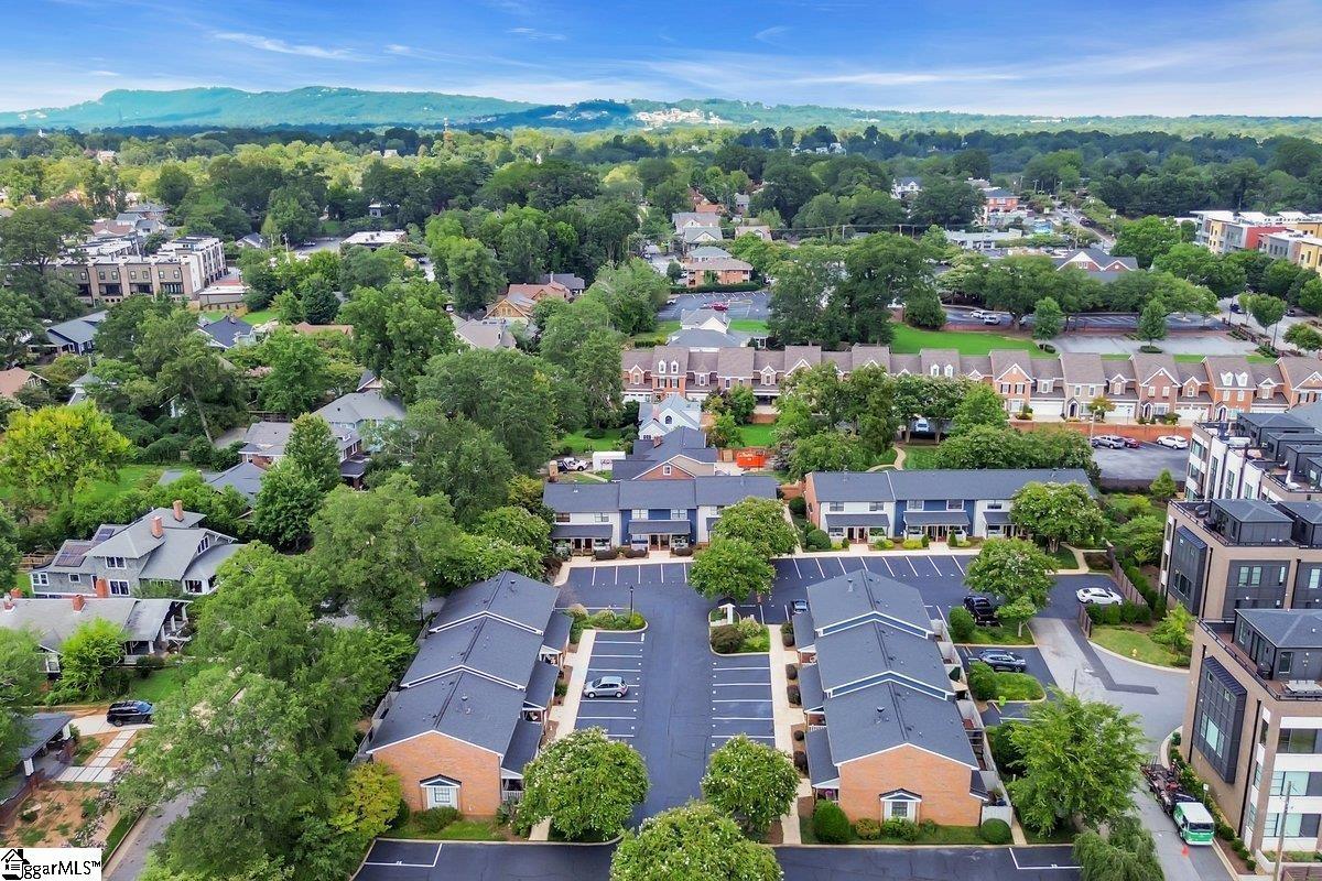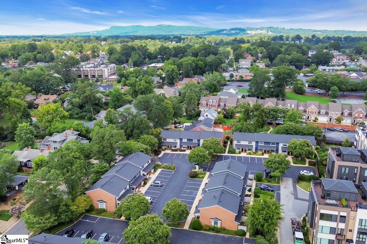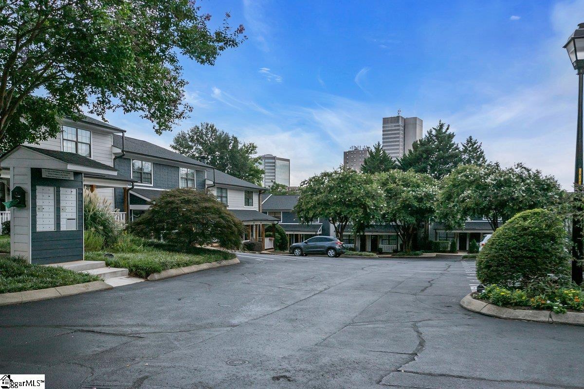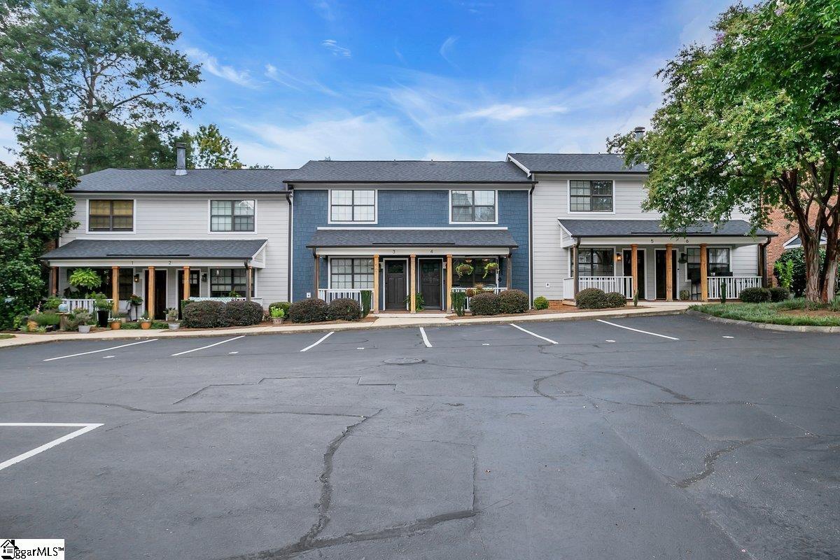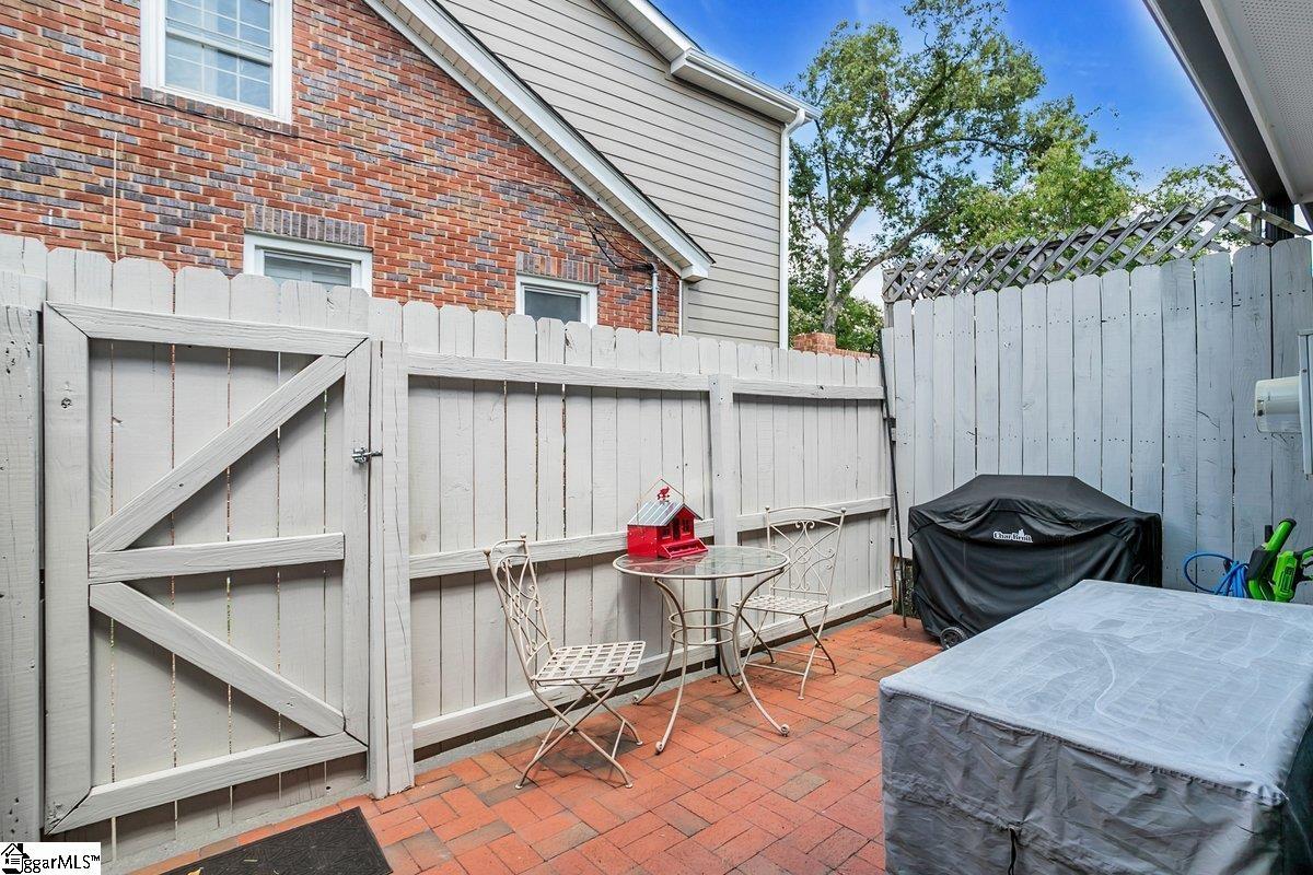 Welcome to this charming two-bedroom, one-and-a-half bath townhome located in the heart of downtown Greenville. Just steps away from shopping, dining, and entertainment. This home offers the perfect blend of convenience and comfort. Inside, you’ll find a bright and inviting living space, a functional kitchen with plenty of cabinet storage, upgraded cabinets with built in drawers, and a custom spice rack along with a cozy dining area. Seller converted the coat closet to a pantry giving you sufficient space for your cooking needs. Upstairs, both bedrooms provide ample closet space and natural light, while the fully renovated bath is conveniently situated between them. The half bath downstairs adds extra convenience for guests. Enjoy your morning coffee or evening unwind on the private patio, ideal for relaxing or entertaining or on the fabulous rocking chair front porch with views of downtown Greenville . With low-maintenance living and a prime location, this townhome is perfect for those looking to experience all that downtown Greenville has to offer. If this wasn't enough, this home is located in the Historic Heritage District. The exterior of the community was renovated in 2023 with new hardyboard, gutters, new porches, and new roofs. The city just announced the vacant shopping center across the street is going to include retail, restaurant, grocery, fitness, coffee, clothing and general convenience. The entire building will be updated on the exterior to match the growing downtown vibe.