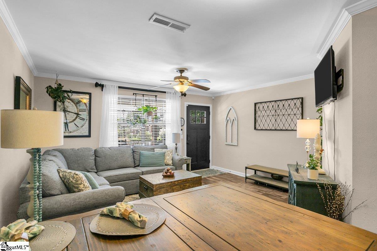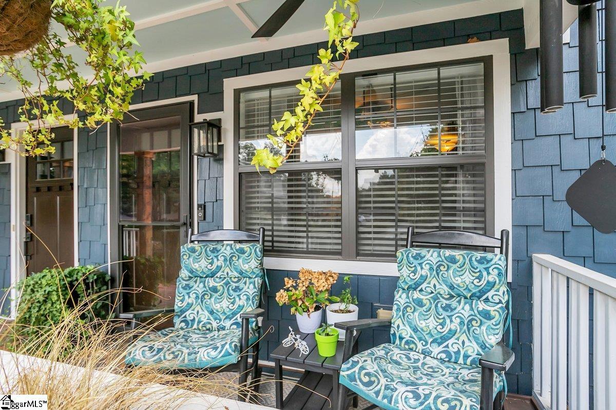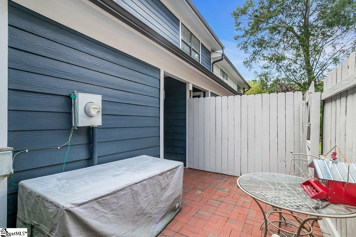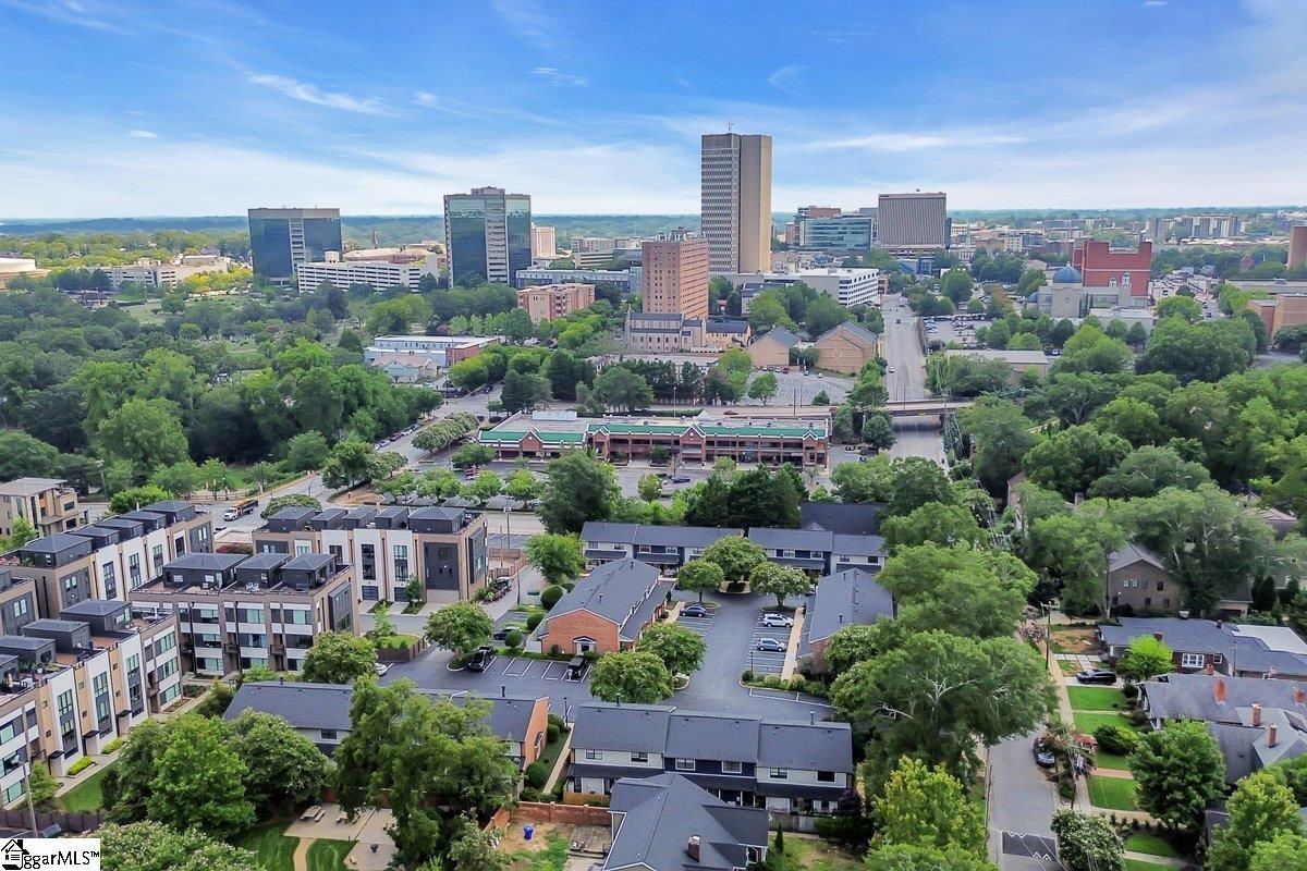 Welcome to this charming two-bedroom, one-and-a-half bath townhome located in the heart of downtown Greenville. Just steps away from shopping, dining, and entertainment. This home offers the perfect blend of convenience and comfort. Inside, you’ll find a bright and inviting living space, a functional kitchen with plenty of cabinet storage, upgraded cabinets with built in drawers, and a custom spice rack along with a cozy dining area. Seller converted the coat closet to a pantry giving you sufficient space for your cooking needs. Upstairs, both bedrooms provide ample closet space and natural light, while the fully renovated bath is conveniently situated between them. The half bath downstairs adds extra convenience for guests. Enjoy your morning coffee or evening unwind on the private patio, ideal for relaxing or entertaining or on the fabulous rocking chair front porch with views of downtown Greenville . With low-maintenance living and a prime location, this townhome is perfect for those looking to experience all that downtown Greenville has to offer. If this wasn't enough, this home is located in the Historic Heritage District. The exterior of the community was renovated in 2023 with new hardyboard, gutters, new porches, and new roofs. The city just announced the vacant shopping center across the street is going to include retail, restaurant, grocery, fitness, coffee, clothing and general convenience. The entire building will be updated on the exterior to match the growing downtown vibe.