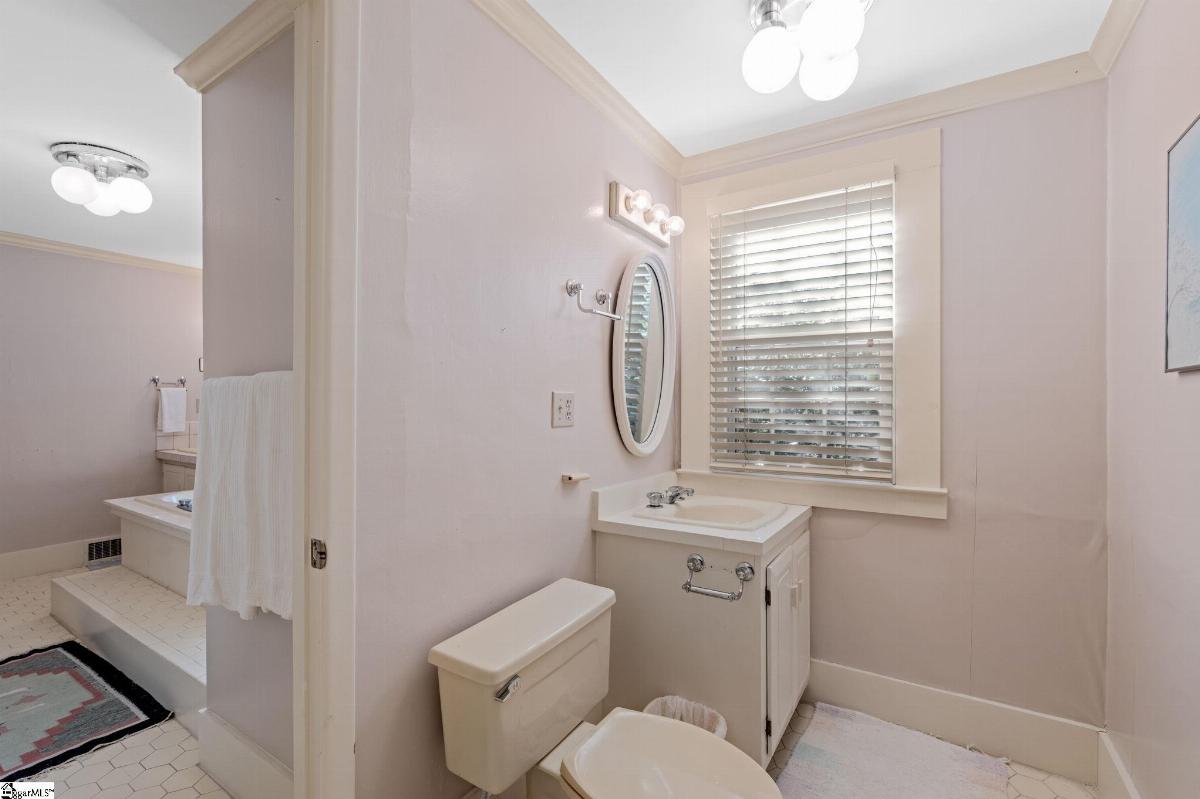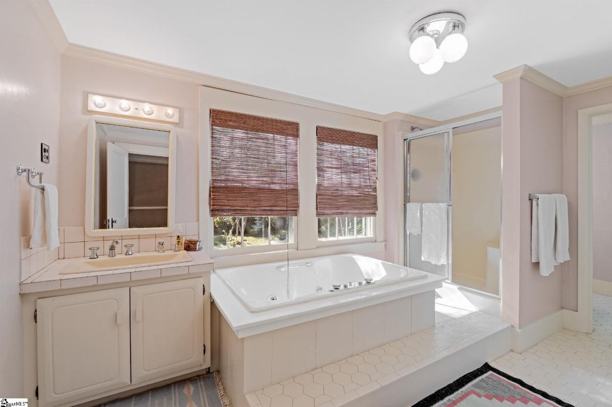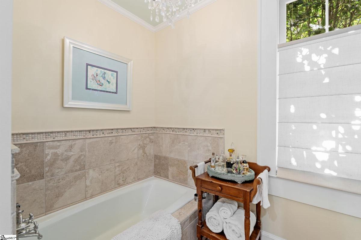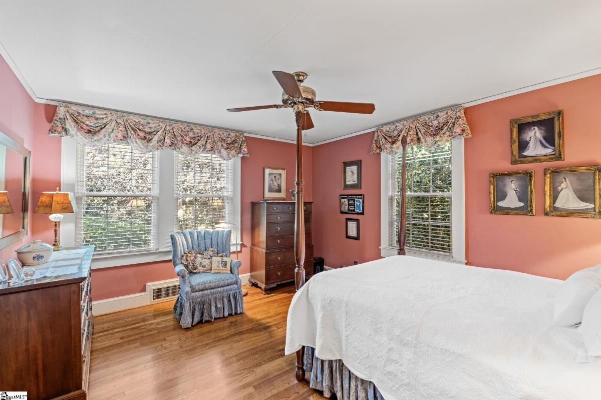 Timeless charm meets classic Greenville character at 47 Douglas Drive. This stately stone home sits gracefully among mature trees and lush landscaping, offering privacy and tranquility just moments from Greenville Country Club and Augusta Road. The granite façade and classic architectural details showcase craftsmanship rarely found today. A welcoming front porch with wrought-iron railings and a cozy awning creates the perfect spot to enjoy morning coffee or greet neighbors. Inside, you’ll find light-filled living spaces that blend warmth and elegance. The living room has a stone fireplace, hardwood floors, and crown molding, perfect for relaxing or hosting guests. A formal dining room with French doors opens to a cheerful sitting room, while the updated kitchen offers vintage charm and modern convenience with white cabinetry, solid-surface countertops, and abundant natural light. The main-level owner’s suite is a peaceful retreat with two walk-in closets and an updated bath featuring a double vanity, glass-enclosed shower, and soaking tub. Upstairs there are two additional bedrooms filled with character, plus a full bath with both tub and shower—perfect for family or guests. Outdoors, a private courtyard-style deck provides a serene space for entertaining or relaxing, surrounded by lush greenery and built-in bench seating. From its historic stonework to its ideal Augusta Road location, this home embodies the very best of Greenville’s timeless character and charm.