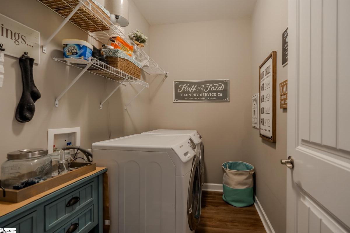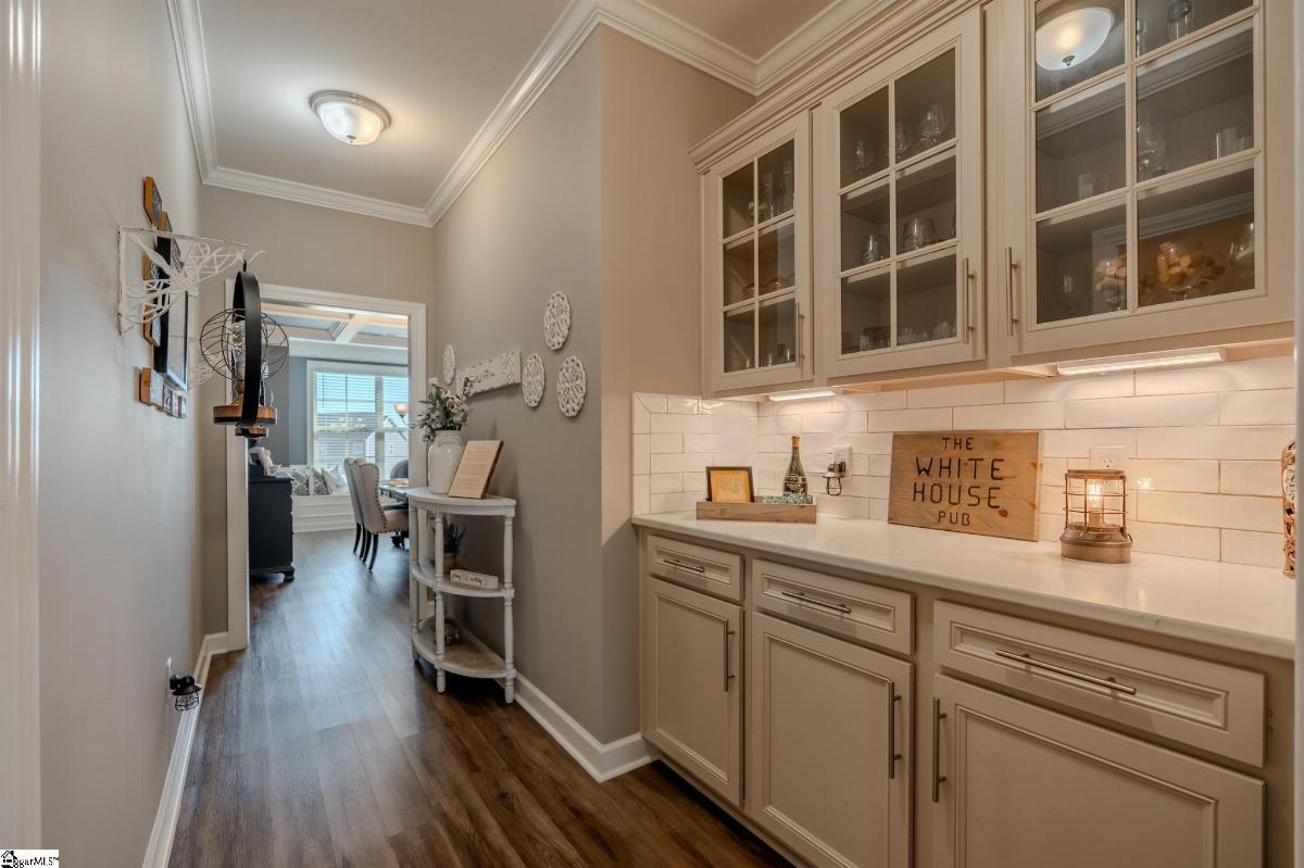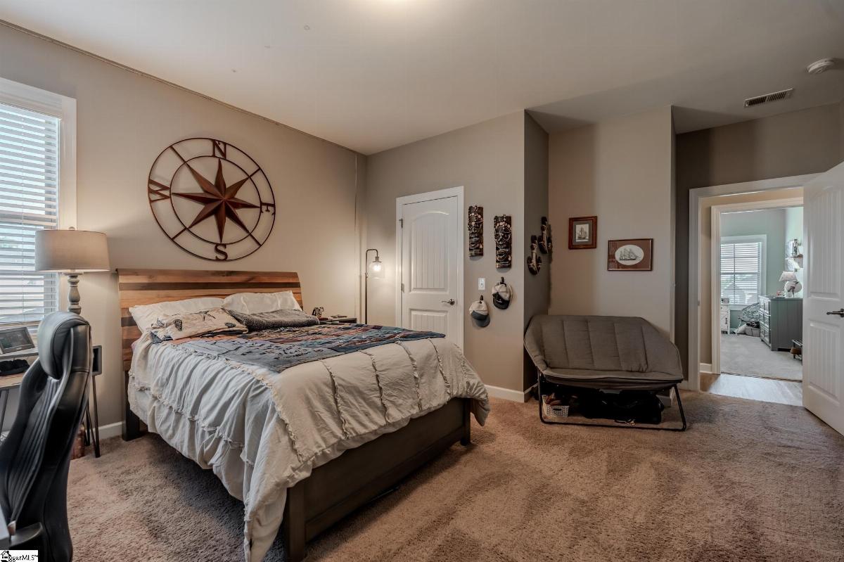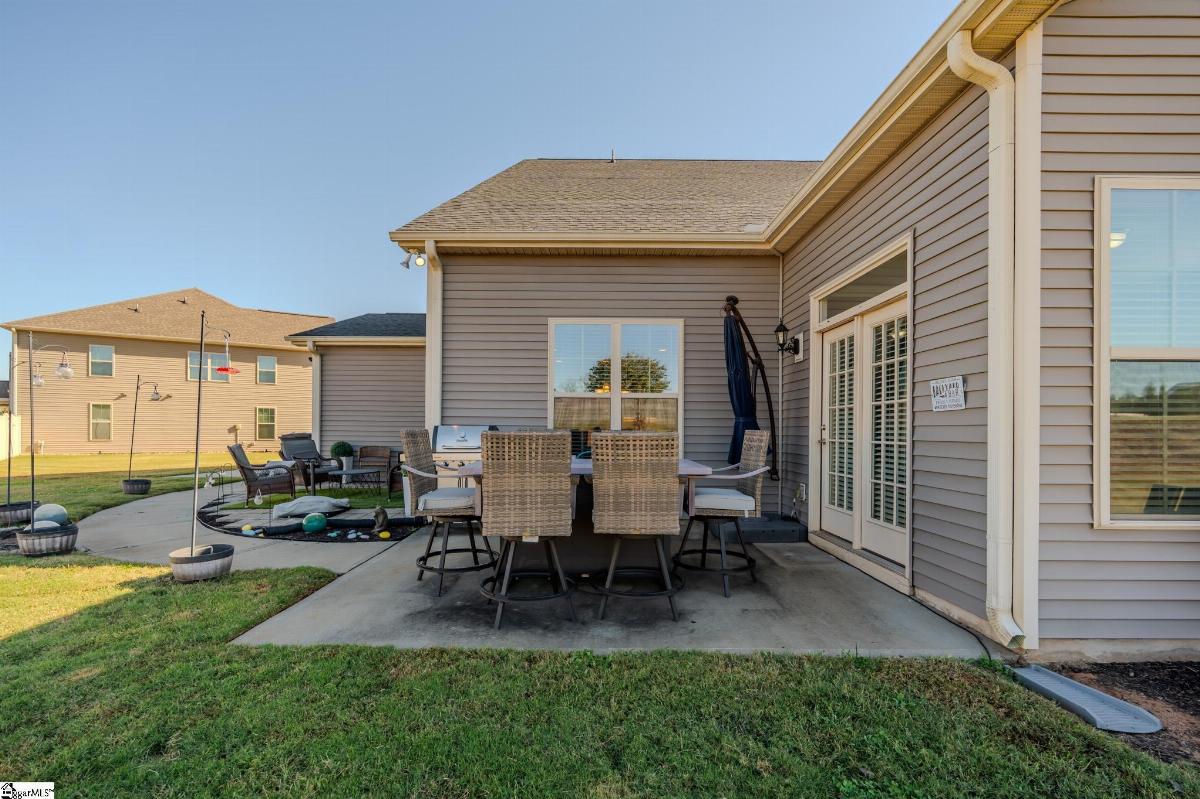 Nestled on a quiet cul-de-sac in the sought-after Coachman Plantation community, this spacious 5-bedroom, 3½-bath, 3 car garage with utility door, home offers the perfect blend of comfort, style, and functionality. Situated on a generous fully irrigated .84-acre lot, this property provides plenty of space both inside and out—ideal for entertaining, relaxing, and everyday living. The inviting main level features a welcoming two story foyer with arched entry ways into the living /office and formal dining room with Coffered ceiling and a Butler’s pantry for effortless entertaining. Beautiful LVP flooring flows throughout all main living areas on the first floor. The heart of the home is the open-concept family room and kitchen, designed for modern living, featuring abundant soft gray cabinetry and sleek Bianco Marina quartz countertop create a fantastic color scheme in the gourmet kitchen with built-in oven and microwave, 5 burner gas cooktop and hood vent, with large eat-in breakfast area that flows seamlessly into the sunroom overlooking the large backyard and patio. The back yard offers you a blank canvas to create the backyard of your dreams. Plenty of room for a pool, plenty of room for a garden, plenty of room for a play set AND plenty of room for fruit trees-you can have it all! The large primary suite is conveniently located on the main level and offers a true retreat with a sitting room, his and her walk in closets, and a luxury bathroom with his and her vanities, soaking tiled tub and over sized shower. Upstairs, you’ll find four spacious bedrooms, with roomy walk-in closets along with 2 full bathrooms. The bonus room upstairs is perfect for a playroom, media room, craft room or home gym. An optional auxiliary laundry room upstairs adds flexibility and convenience for busy households. Located within the highly rated Rudolph Gordon and Fountain Inn High School District, this home combines the charm of a peaceful neighborhood with the convenience of nearby shopping, dining, and easy access to I-385. The Patterson C plan checks every box—space, comfort, and an ideal location. Don’t miss your chance to make it yours!