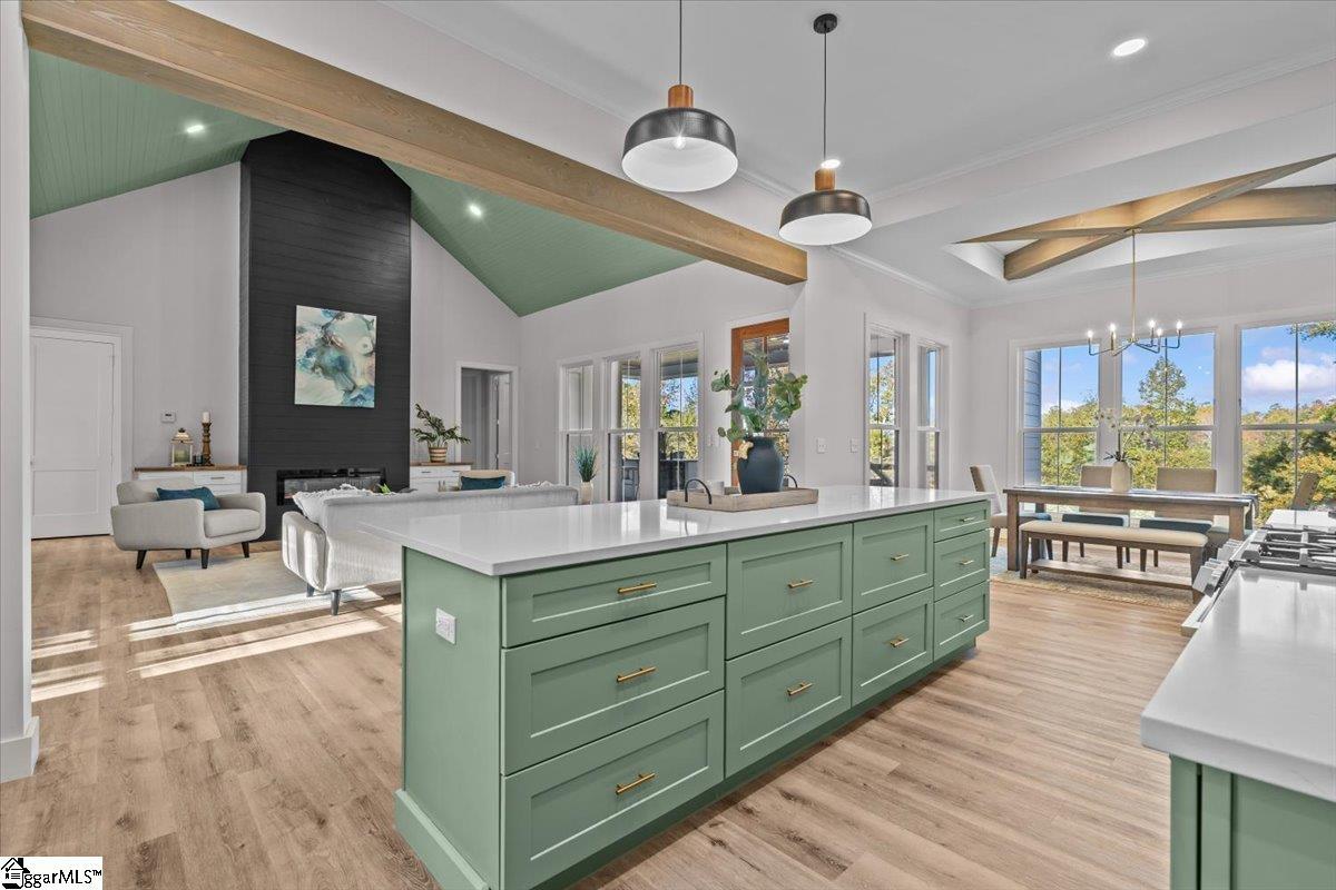 Welcome to luxurious lakefront living on beautiful Lake Cunningham. This brand-new custom home offers stunning views, timeless design, and approval for your own private dock — the perfect blend of comfort and waterfront adventure. Inside, soaring ceilings and an open layout highlight breathtaking lake views. The living room features a striking black shiplap fireplace and flows seamlessly into the designer kitchen with green cabinetry, quartz countertops, and premium appliances. The primary suite captures peaceful water views and includes a walk-in closet and a spa-inspired bath with gold fixtures and dual vanities. Upstairs, the finished flex room includes its own full bathroom, making it ideal as a second master suite, guest retreat, or private home office. Enjoy outdoor living year-round on the screened-in back porch with a built-in outdoor kitchen, perfect for morning coffee, summer cookouts, or sunset dinners overlooking the lake. Set on a quiet cul-de-sac just minutes from downtown Greer, this home delivers elegance, functionality, and true lakefront living at its best. Dock-approved and move-in ready — 17 Cunningham Point Court invites you to live the lake life.