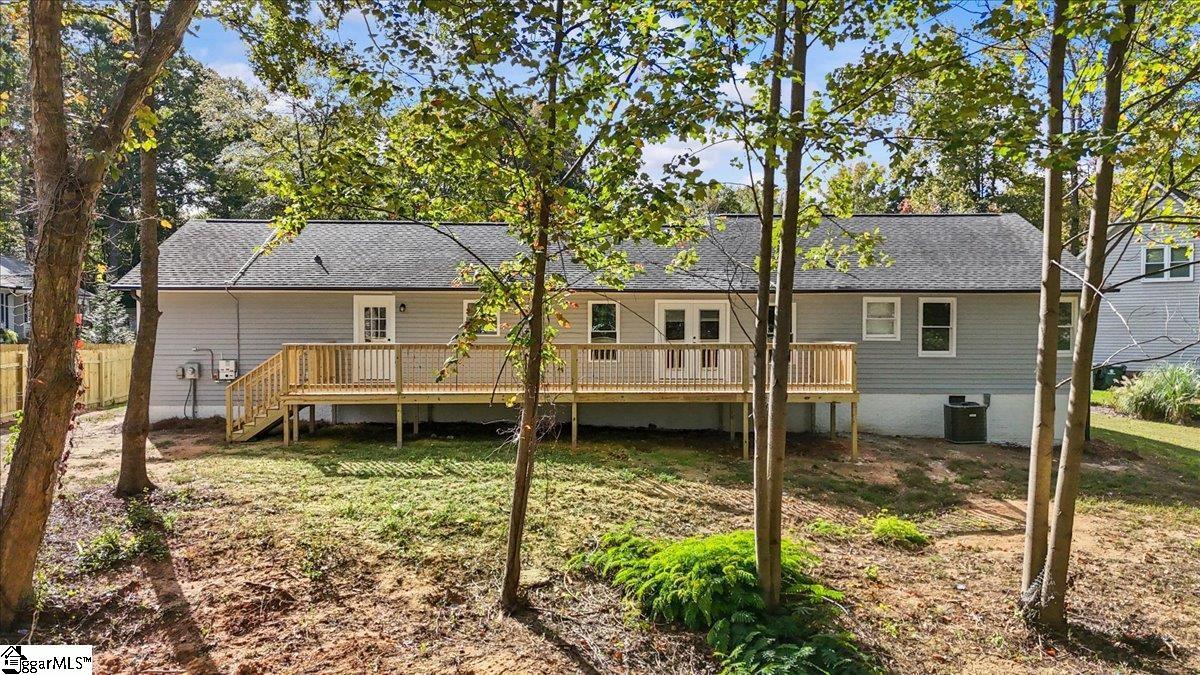 Charming 3 Bedroom, 2 Bath Home on 0.5 Acre in Established Neighborhood! Tucked away in a quiet cul-de-sac, this beautiful home offers privacy and convenience—just minutes from shopping, grocery stores, and restaurants. Enjoy relaxing on the inviting covered front porch with custom wooden railing before stepping inside to a spacious living area featuring vaulted ceilings, recessed lighting, two storage closets, and luxury vinyl flooring that flows throughout the home. The kitchen offers granite countertops, recessed lighting, and an open layout to the dining/breakfast area with a large window for natural light. A nearby laundry area and access to the garage—with an additional storage closet—add convenience. Down the hall, you’ll find spacious bedrooms accented by custom sliding barn doors for closets, and a hall bath with a ceramic tub/shower. The master suite features a walk-in closet, double vanity, and a stunning tiled shower. Step outside from either the living room or kitchen to an oversized 12x40 deck overlooking a large, private backyard that backs to a wooded area and peaceful creek. Paid-off solar panels provide energy efficiency and long-term savings—ready for you to enjoy!