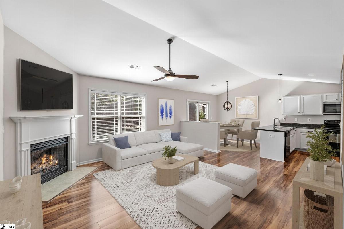 This beautifully maintained 3-bedroom, 2-bath patio home features an open floor plan with a spacious living room with a cozy gas fireplace and abundant natural light. The kitchen seamlessly connects to the living area and boasts black and stainless appliances, updated fixtures, and a newer refrigerator. Primary on the main with trey ceiling, walk-in closet, sink and a tub/shower. Updates throughout, including newer bathroom vanities, flooring, and light fixtures. The low-maintenance backyard is perfect for relaxing or entertaining with an extended patio and fenced yard. Additional features include a newer washer and dryer and convenient access to highly sought-after Riverside schools.