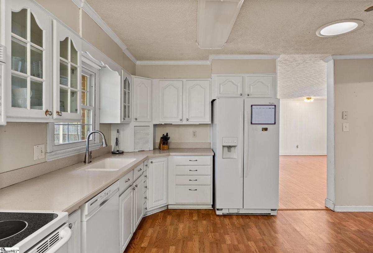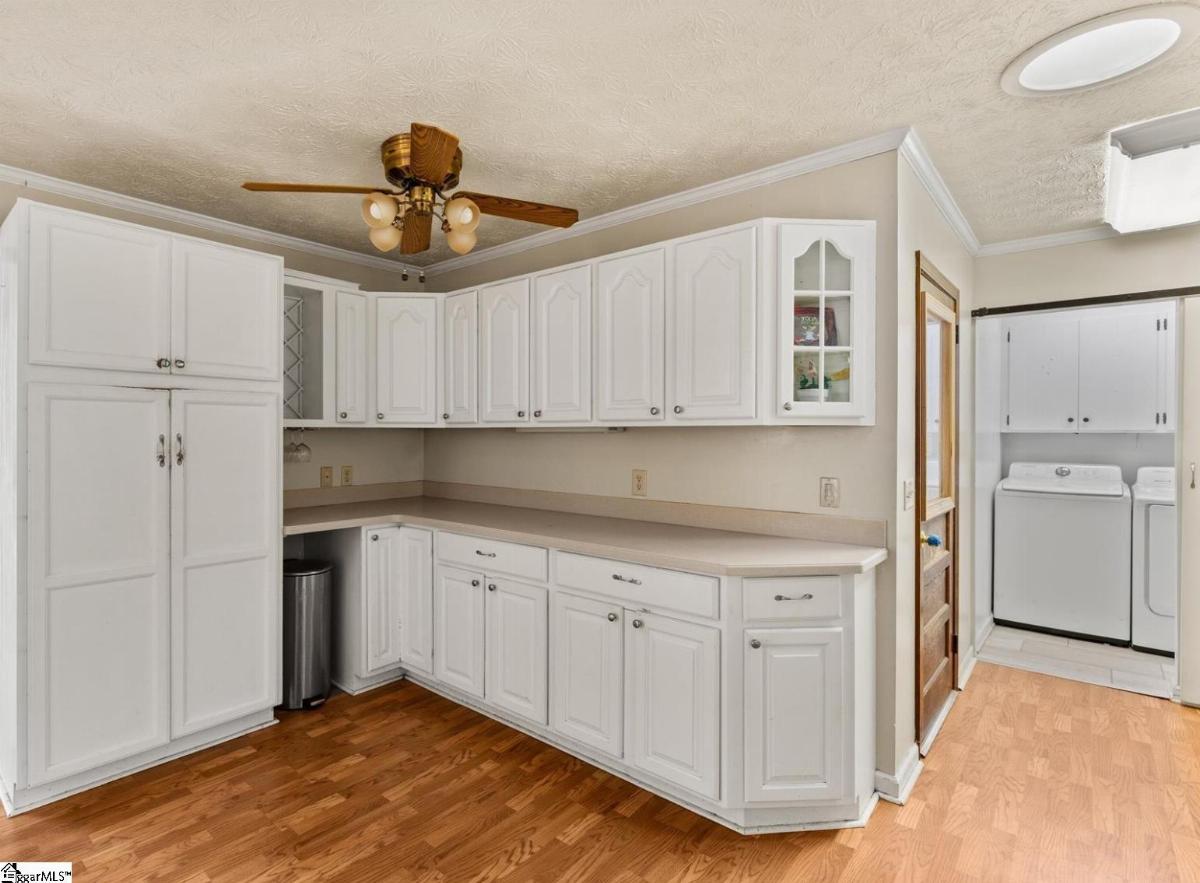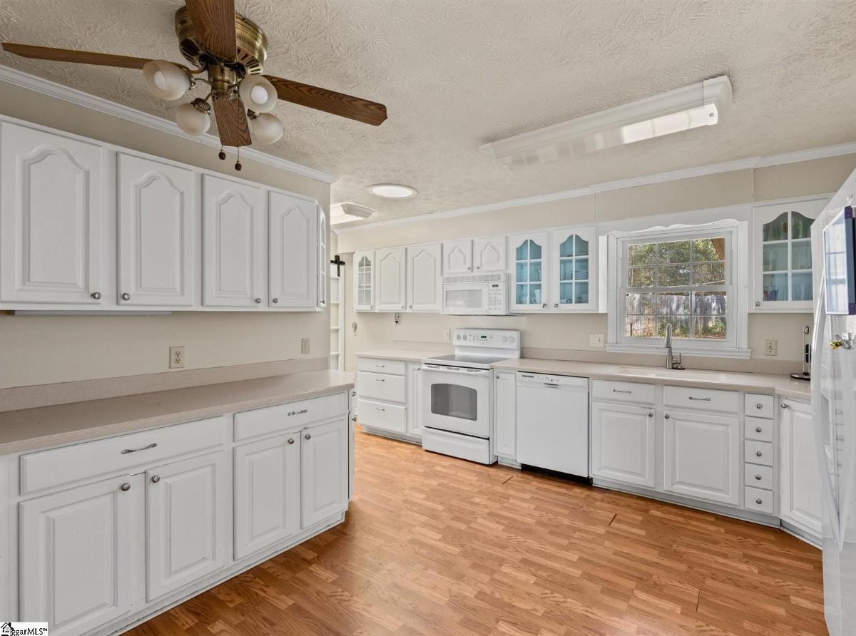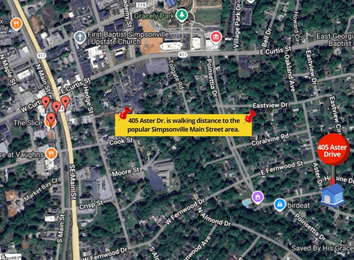 LOCATION! LOCATION! LOCATION! Get ready to fall in love with the lifestyle that comes as the new homeowner of 405 Aster Drive in the highly sought-after Poinsettia subdivision in Simpsonville! From this prime location, you can walk, bike, or take a golf cart ride to the charming Main Street area of Downtown Simpsonville where you’ll find coffee houses, specialty shops, services, restaurants, pubs, and retail storefronts. Known for its neighborly vibe and long tradition of community swim events at the Poinsettia Pool, this established Simpsonville neighborhood offers a classic hometown feel where lifelong friendships are made. Local hotspots like the Heritage Park Amphitheater is 2.5 miles away, Discovery Island water park is less than 5 miles away, and when you’re ready for some night-life, Downtown Greenville is only a 7 mile drive from this home! Nearby public schools are all highly rated according to Niche.com. While the location is clearly premier, the property does need some work which is reflected in the price. However, there are many good qualities to mention such as the great curb appeal with mature landscaping and draping trees that line the streets and frame the front yard view as you drive up, the home’s solid brick construction, its great looking and low-maintenance brick and cement plank siding, the spacious 0.34 acre lot the home sits nestled on, and the fully fenced backyard with a covered grilling patio and powered storage outbuilding. In addition, step through the front door into a welcoming foyer that leads to an open layout including a family room with a fireplace, a flex room with expansive views of the front yard making it ideal as a relaxing sunroom or charming formal dining room, and a second flex room, accessed through double french doors, off the family room that would make a great home office, playroom, or teen hangout. There are 3 bedrooms and 2 full bathrooms and everything is conveniently located on one level in this ranch-style home. Rounding out the floorplan is the bright, spacious kitchen with white cabinets and matching appliances, tons of storage, a kitchen sink with a window view, and even a custom floor-to-ceiling built-in pantry. The laundry room is tucked beside the kitchen with a barn door that provides stylish form and smart function. Also adjacent to the kitchen is the 2-car attached garage entry making off loading groceries and shopping items a breeze. Finally, the skylights throughout the home are a unique design bonus that bring in cheerful natural light from every angle. Don’t miss your chance to be a homeowner in one of Simpsonville’s most popular neighborhoods where you can enhance what is already a true gem and start enjoying the fun, friendly, unique, and neighborly lifestyle that living in Downtown Simpsonville offers!