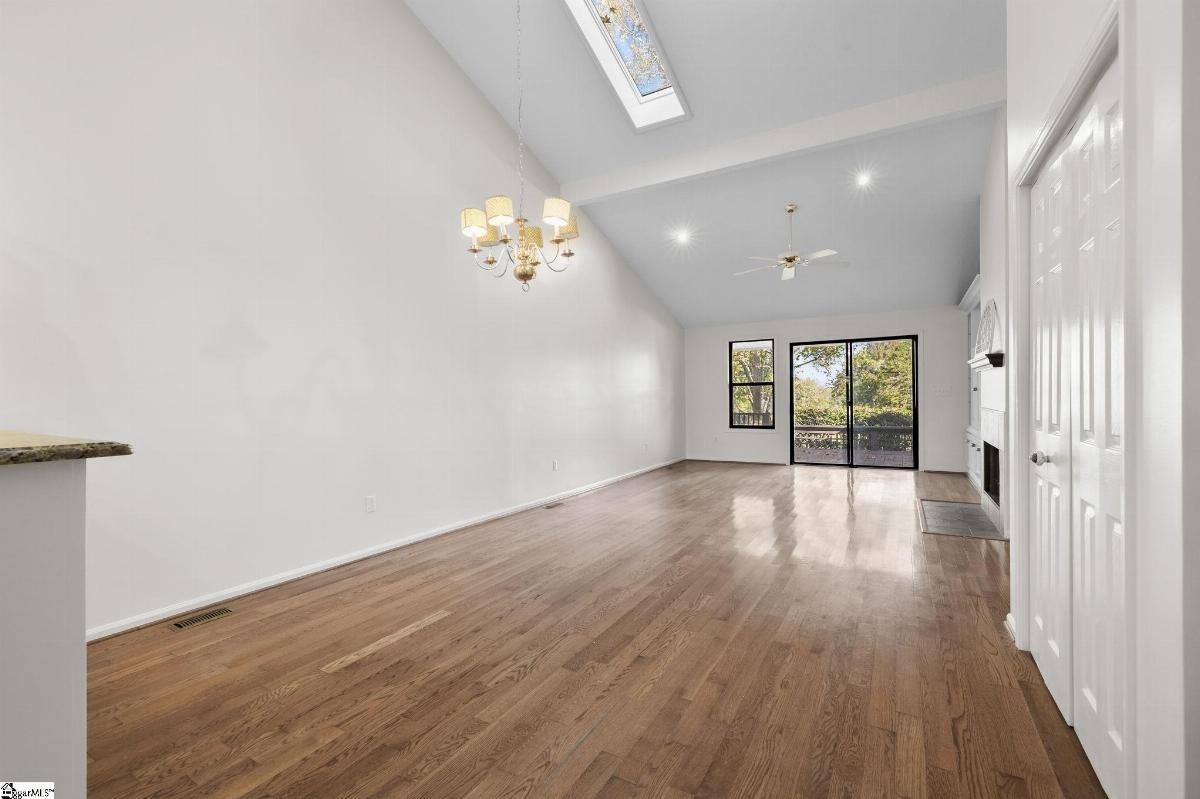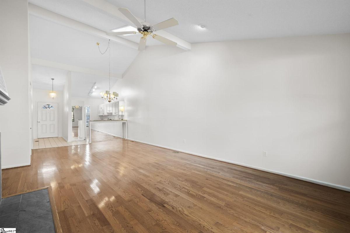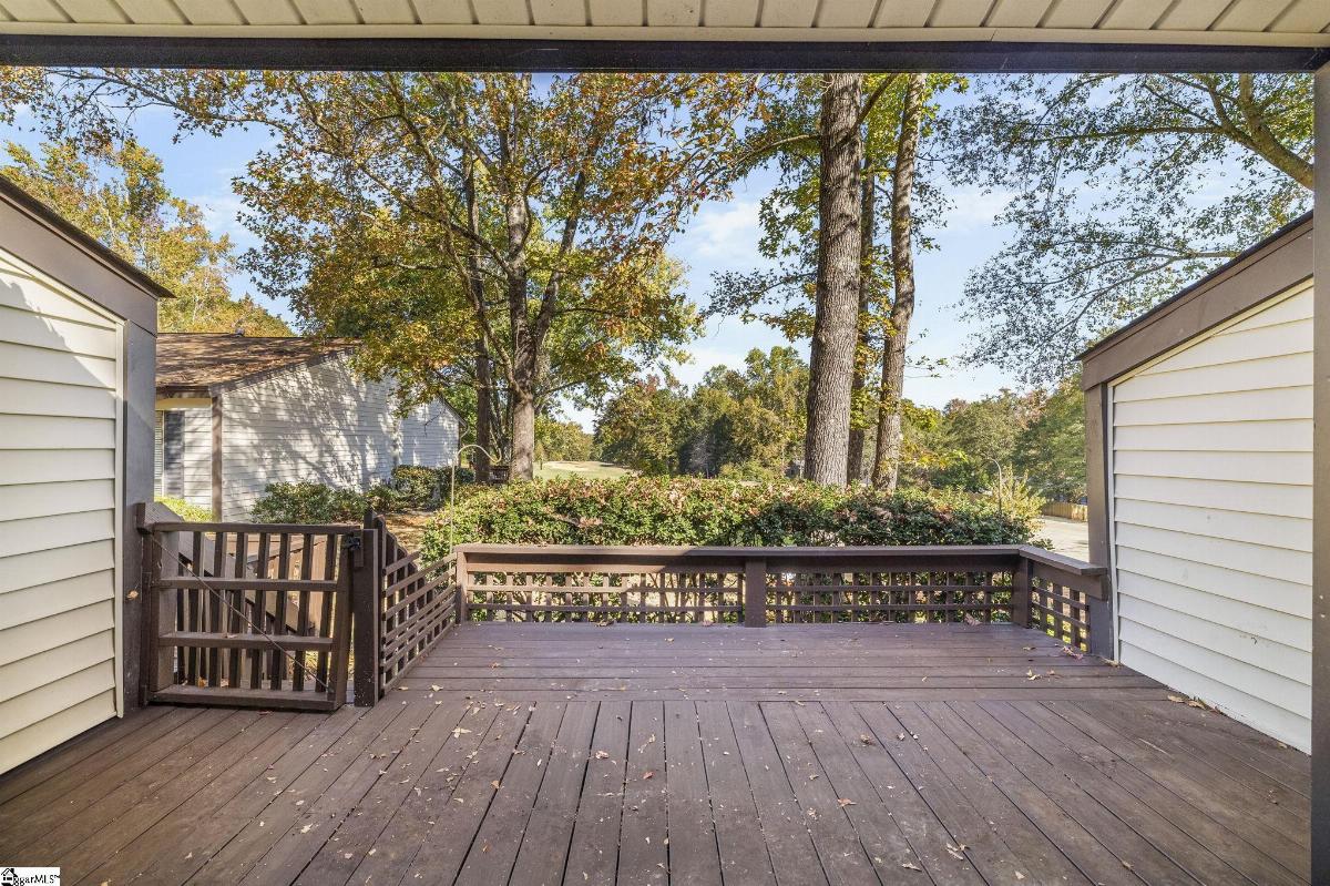 Move-in ready condo with peaceful golf course views! This open-concept home features soaring ceilings, hardwood floors in the main living areas, and brand-new carpet in the bedrooms. The kitchen features granite countertops, a full appliance package, bar-top seating, and ample space for serving, while the large dining area flows seamlessly into the vaulted great room with built-ins and a cozy gas log fireplace—perfect for entertaining or relaxing. The spacious primary suite boasts multiple closets, including a walk-in with built-ins, and a private bath with dual sinks, a garden tub, and a separate shower. Two secondary bedrooms share a spacious hall bath with one bedroom enjoying direct access. Enjoy your morning coffee or evening grill session on the expansive deck overlooking the fairway. Tucked away at the back of the complex for added privacy, this home also has ample parking in a dog- and jog-friendly community. With virtually maintenance-free living, you’ll have more time to spend with friends and family, enjoy a round of golf, or simply relax and take in the view. Conveniently located near shopping, dining, and entertainment with easy access to I-385. Welcome Home!