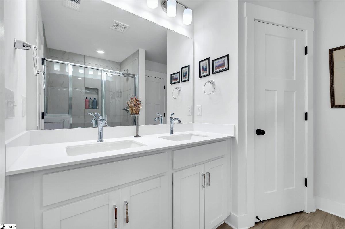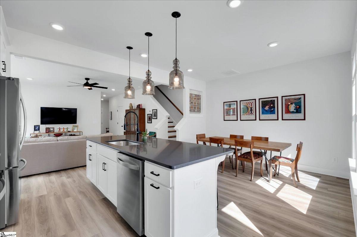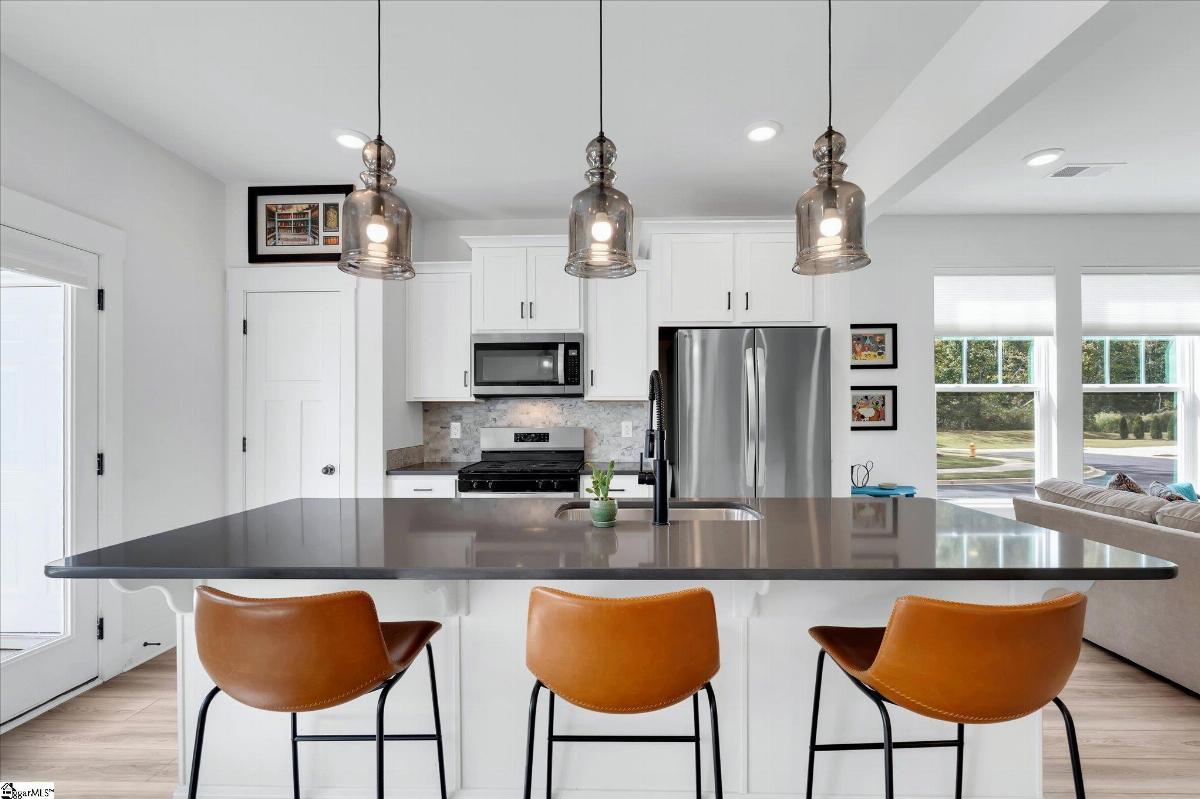 Call or text 864.322.8000 for a private showing. Welcome home to this bright and spacious end-unit townhome in Travelers Rest, SC! This well maintained home is in like-new condition, offers 3 bedrooms, 2.5 baths, and a 1-car garage, thoughtfully designed with comfort and convenience in mind. Step inside to a spacious foyer leading into an open-concept great room, kitchen, and sunny breakfast room; perfect for everyday living and entertaining. The kitchen boasts granite countertops, stainless steel appliances, gas range with tile backsplash and pendant lighting over the eat-in bar. Recessed lighting and custom adjustable blinds add a stylish touch throughout. Upstairs, you’ll find all three bedrooms, including a large primary suite with -double vanity and a walk-in tile shower with built-in seat and shelf. The second full bath provides extra counter space, and the laundry closet with overhead shelving is conveniently located on the same level. Enjoy outdoor living with a private back patio. The community offers fantastic amenities including a fenced dog park, guest parking, paved sidewalks, and included lawn maintenance for easy living. Additional features include ceiling fans in every room, half bath on the main level, an attached storage room located off the back patio and extra windows for plenty of natural light thanks to the end-unit location. This move-in ready townhome blends modern finishes with low-maintenance living—all just minutes from downtown Travelers Rest and the Swamp Rabbit Trail!