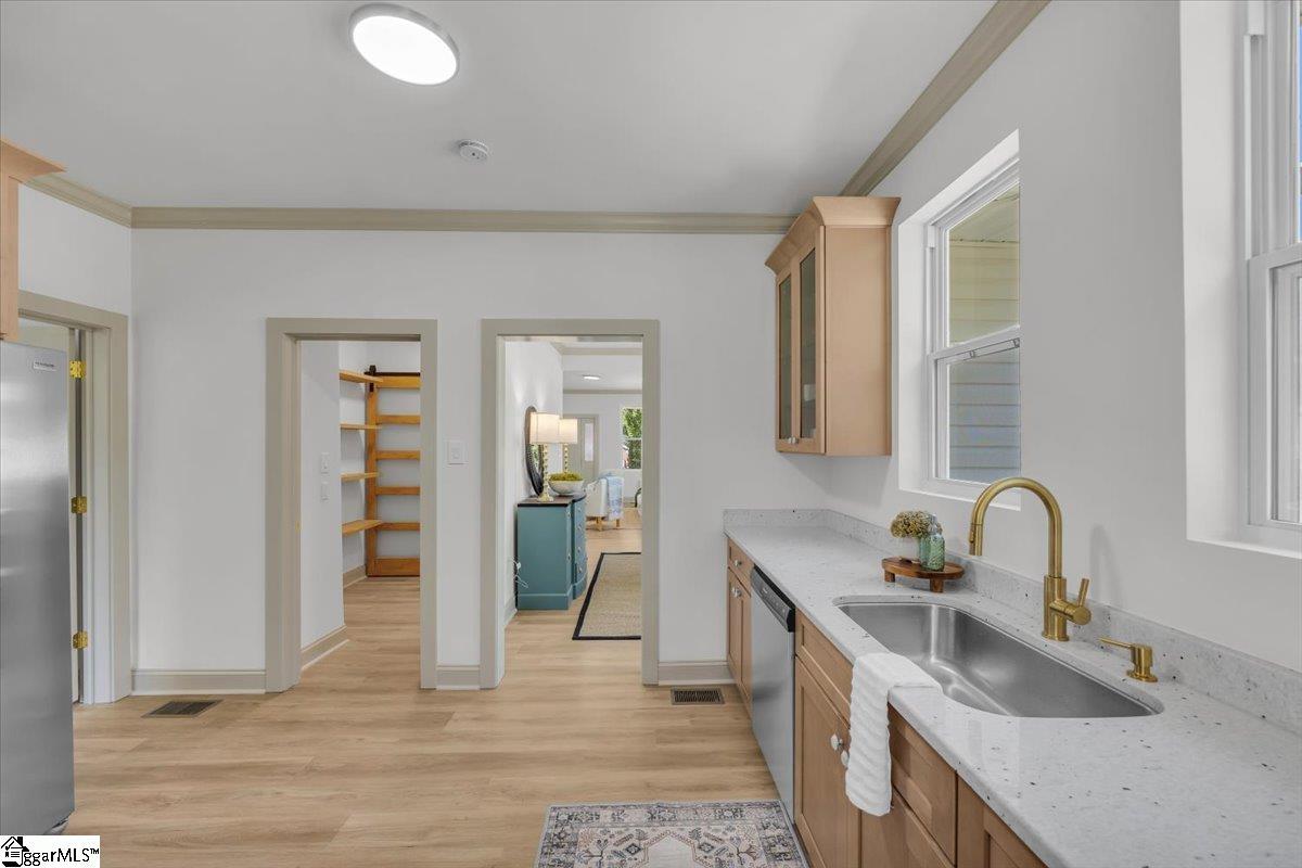Step into this fully renovated bungalow that blends timeless charm with modern updates, all just minutes from the heart of downtown and walkable to the rail trail. As you enter, you’ll be welcomed by soaring ceilings, abundant natural light from brand-new windows, and durable LVP flooring throughout. The functional layout begins with a cozy living room and flows into a spacious dining area and stunning kitchen featuring new cabinetry, granite countertops, and stainless-steel appliances. Two comfortable bedrooms share a stylish full bath, while a walk-in pantry and dedicated laundry room add everyday convenience. The private primary suite completes the home, offering generous natural light and a beautifully updated bathroom—your perfect retreat. Move-in ready and designed with care, this home offers both character and efficiency. Don’t miss your chance to enjoy all the benefits of downtown Spartanburg living—schedule your showing today! BUYERS CAN RECEIVE A FREE 1 POINT RATE REDUCTION the first year paid by a lender credit, with an accepted contract and financed with Amanda McCall at Prime Lending for all contracts written through November 15th. Available for qualifying loan types only (Conventional, FHA, USDA, VA).